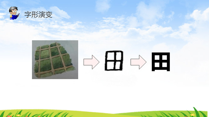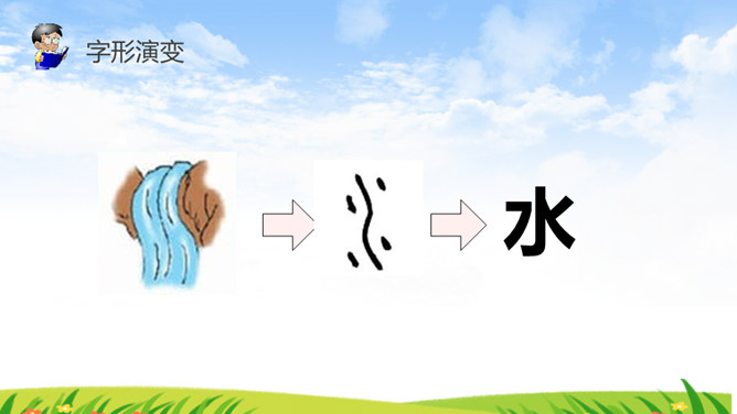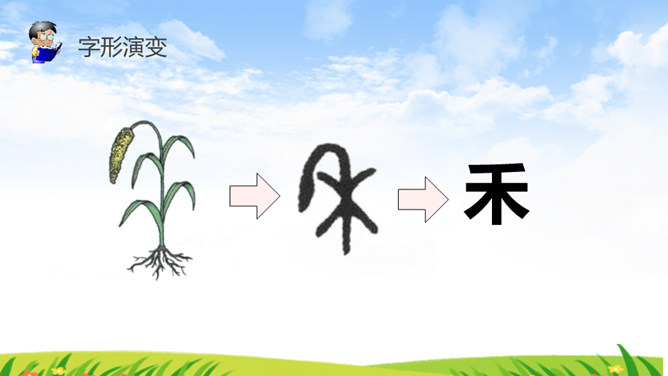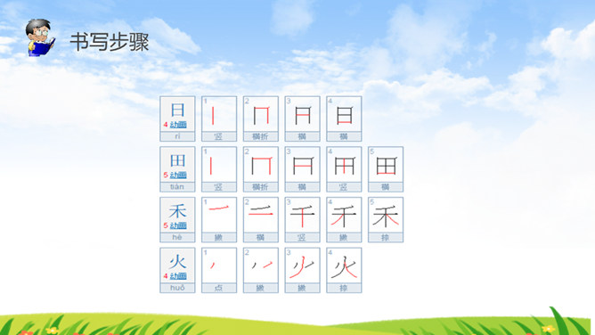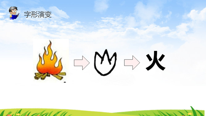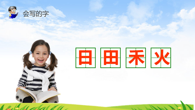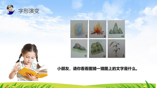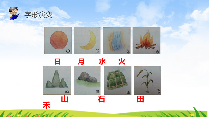 《识字4 日月水火》部编版语文课件 一年级上册。小朋友,请你看看图猜一猜图上的文字是什么。字形演变 书写步骤会写的字 日田禾火。感谢各位的聆听。所属专题: