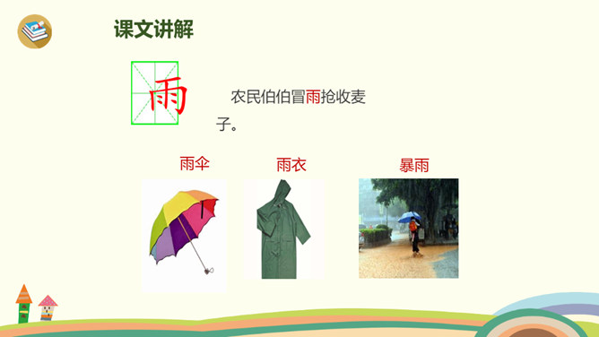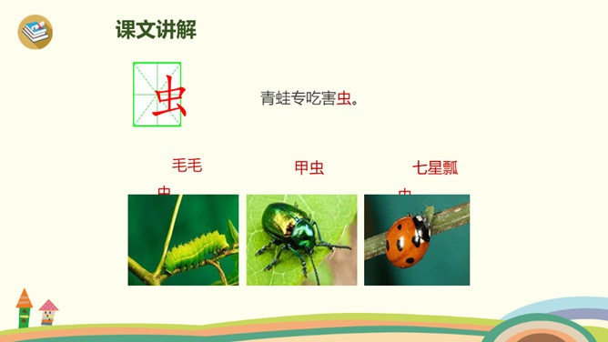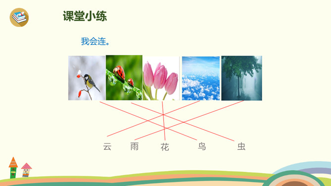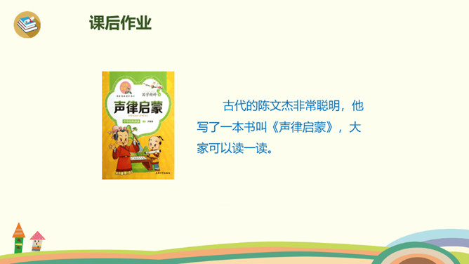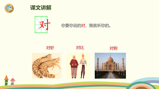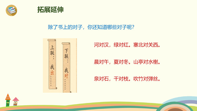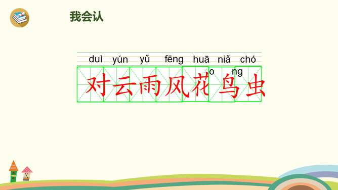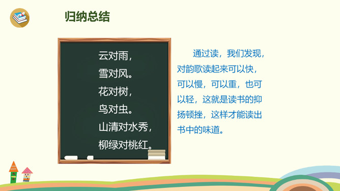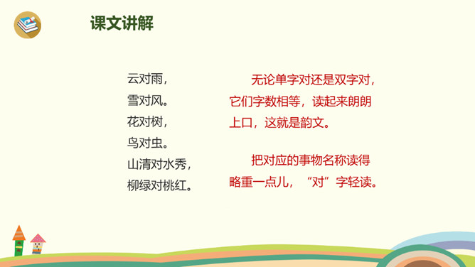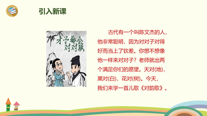 今天,我们来学一首儿歌《对韵歌》。无论单字对还是双字对,它们字数相等,读起来朗朗上口,这就是韵文。把对应的事物名称读得略重一点儿,“对”字轻读。通过读,我们发现,对韵歌读起来可以快,可以慢,可以重,也可以轻,这就是读书的抑扬顿挫,这样才能读出书中的味道。古代有一个叫陈文杰的人,他非常聪明,因为对对子对得好而当上了钦差。你想不想像他一样来对对子?老师就出两个满足你们的愿望。天对(地),黑对(白),花对(树)。 除了书上的对子,你还知道哪些对子呢?河对汉,绿对红。塞北对关西。