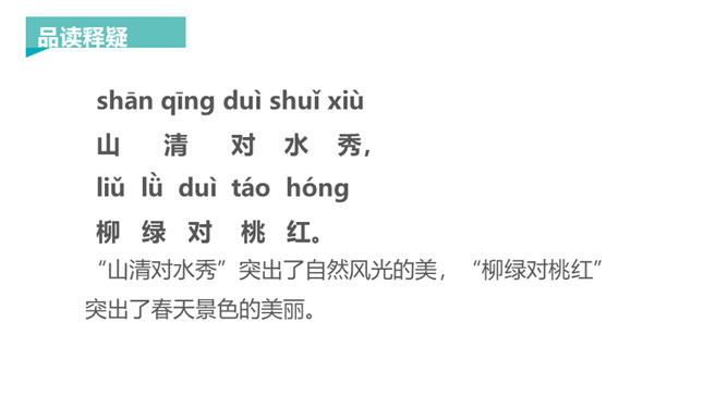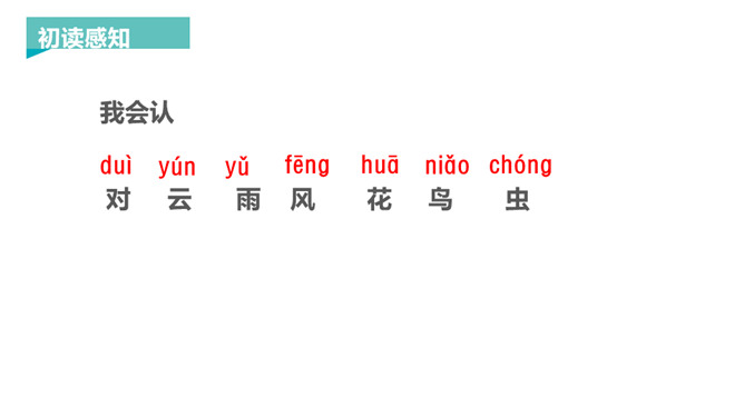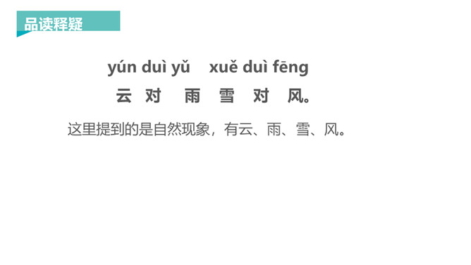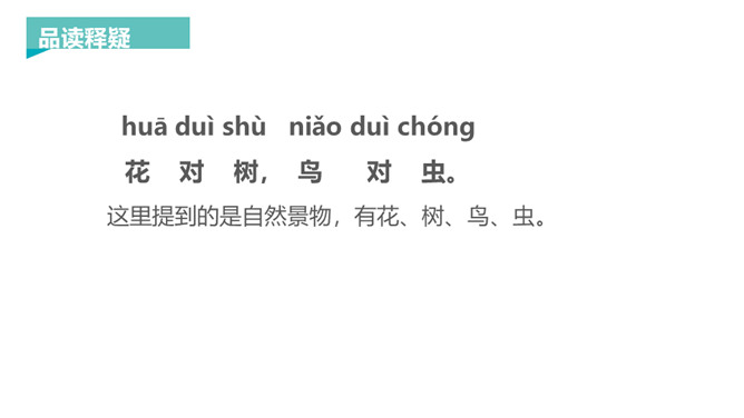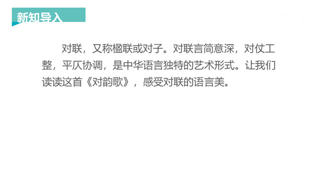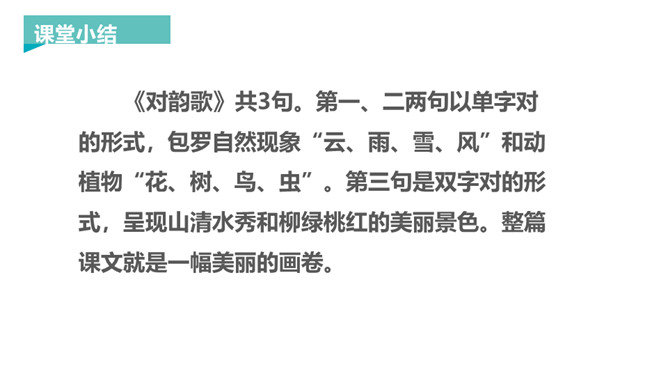 新知导入:对联,又称楹联或对子。对联言简意深,对仗工整,平仄协调,是中华语言独特的艺术形式。让我们读读这首《对韵歌》,感受对联的语言美。这里提到的是自然现象,有云、雨、雪、风。这里提到的是自然景物,有花、树、鸟、虫。山清对水秀”突出了自然风光的美,“柳绿对桃红”突出了春天景色的美丽。《对韵歌》共3句。第一、二两句以单字对的形式,包罗自然现象“云、雨、雪、风”和动植物“花、树、鸟、虫”。第三句是双字对的形式,呈现山清水秀和柳绿桃红的美丽景色。整篇课文就是一幅美丽的画卷。