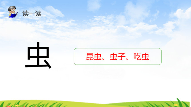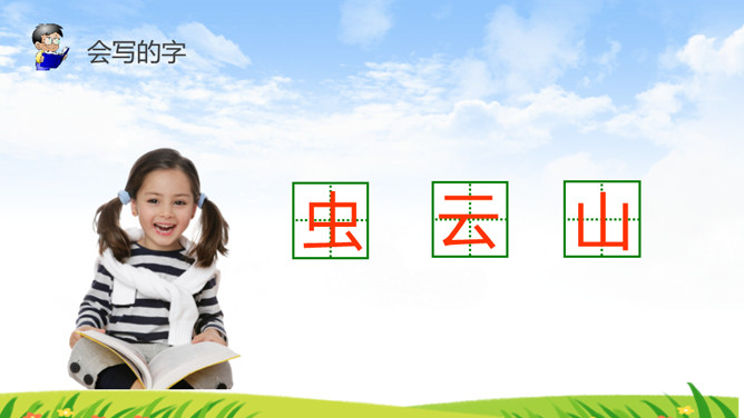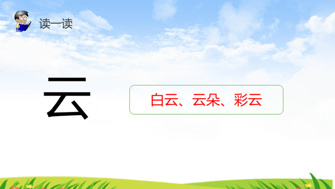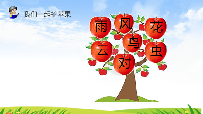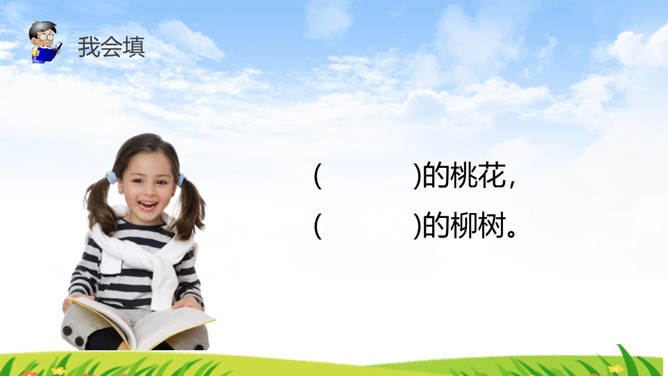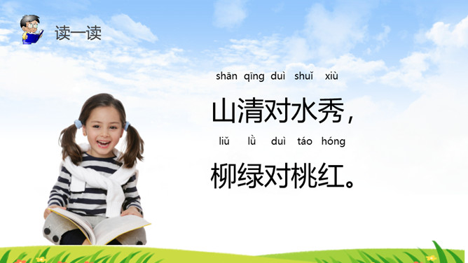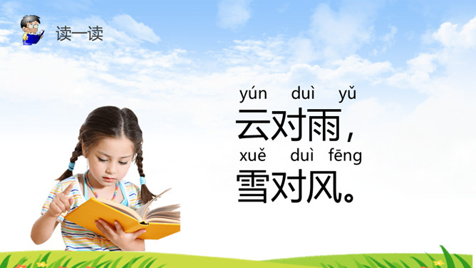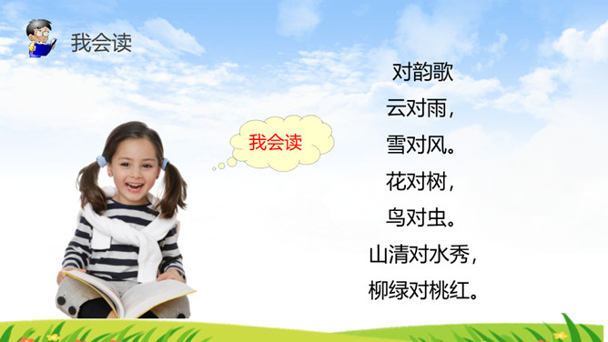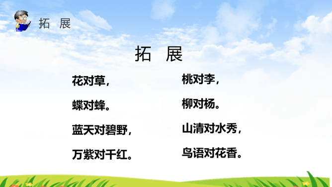 拓展:花对草,蝶对蜂。蓝天对碧野,万紫对千红。桃对李,柳对杨。山清对水秀,鸟语对花香。我会读:对韵歌 云对雨,雪对风。花对树,鸟对虫。山清对水秀,柳绿对桃红。
