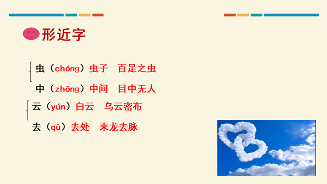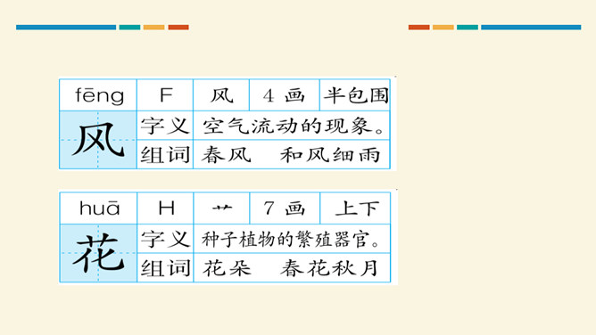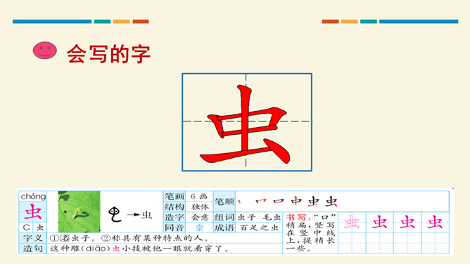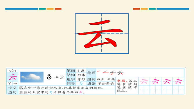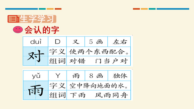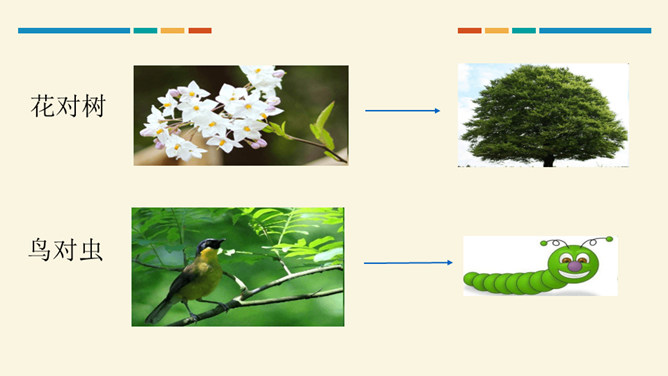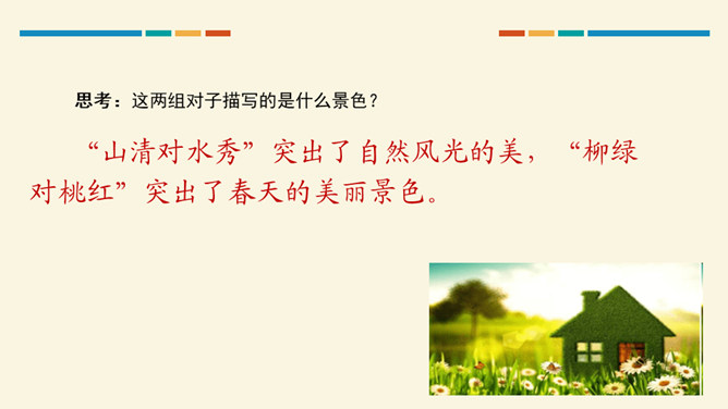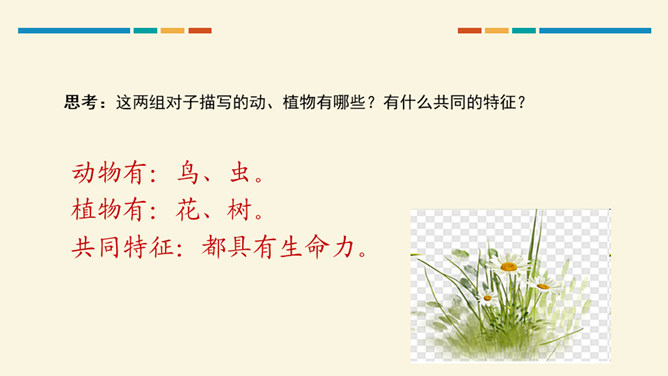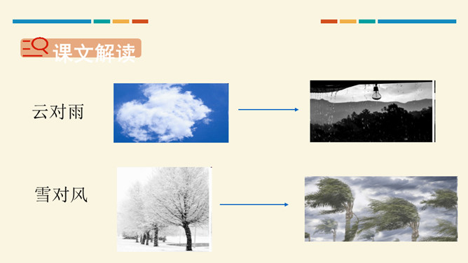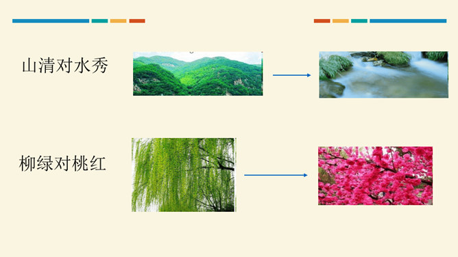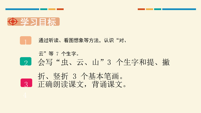 学习目标:通过听读、看图想象等方法,认识“对、云”等 7 个生字。会写“虫、云、山”3 个生字和提、撇折、竖折 3 个基本笔画。正确朗读课文,背诵课文。思考:这两组对子描写的是什么?描写的是自然现象,有云、雨、雪、风。思考:这两组对子描写的动、植物有哪些?有什么共同的特征?动物有:鸟、虫。植物有:花、树。共同特征:都具有生命力。山清对水秀”突出了自然风光的美,“柳绿对桃红”突出了春天的美丽景色。