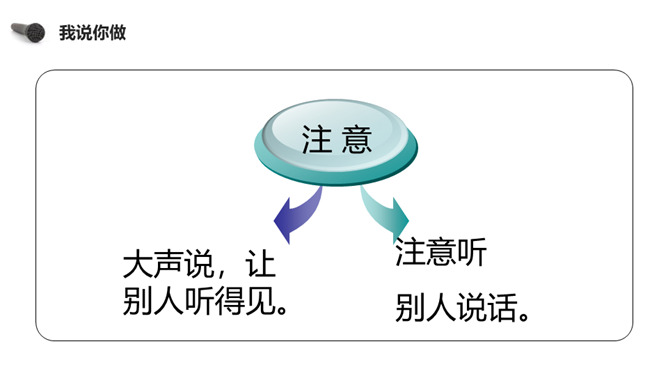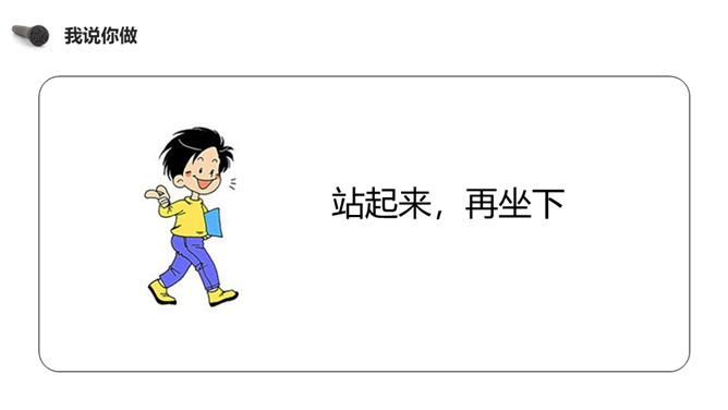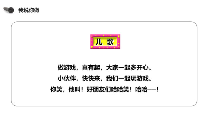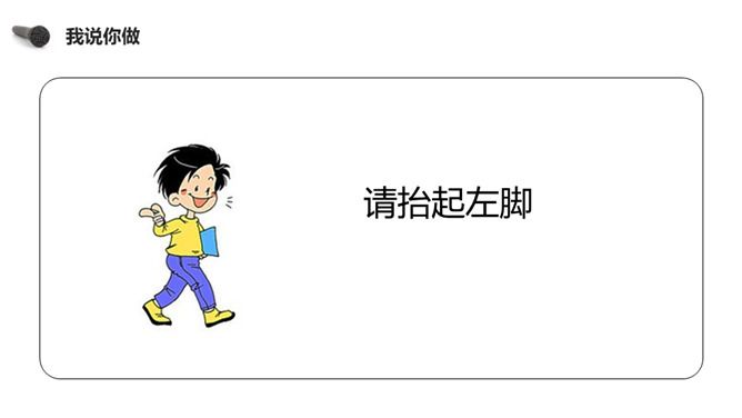 请抬起左脚。站起来,再坐下。注意:大声说,让别人听得见。注意听别人说话。儿歌:做游戏,真有趣,大家一起多开心。小伙伴,快快来,我们一起玩游戏。你笑,他叫!好朋友们哈哈笑!哈哈──!所属专题:我说你做ppt。