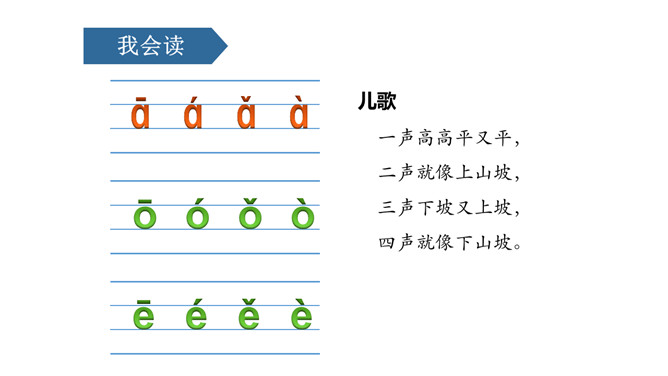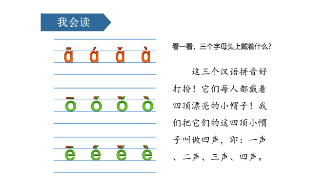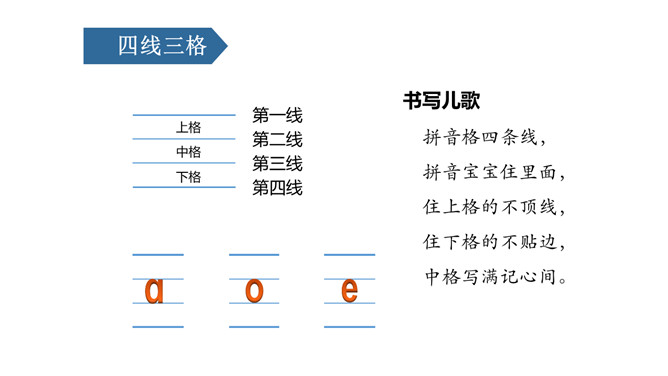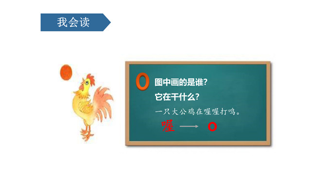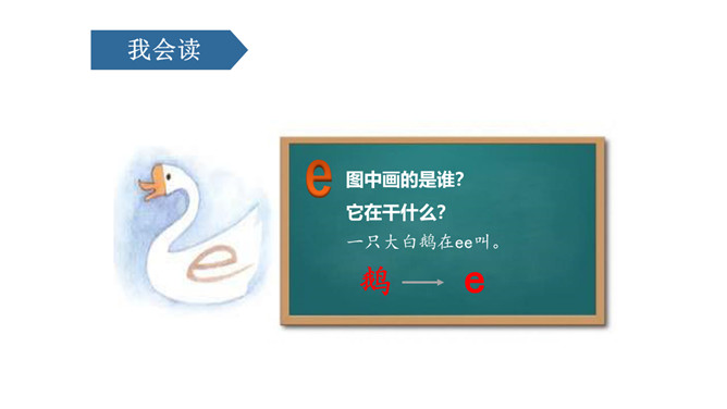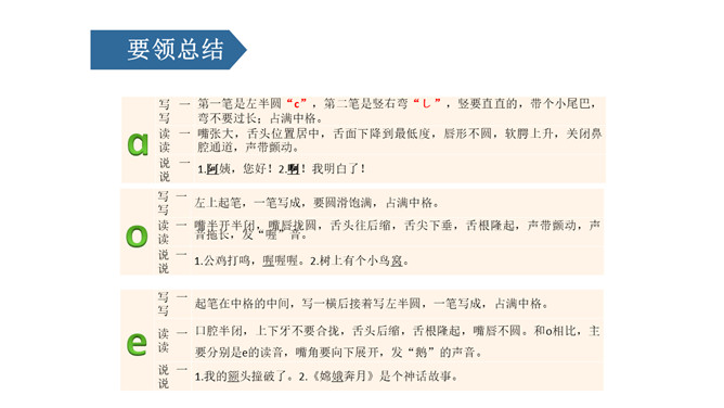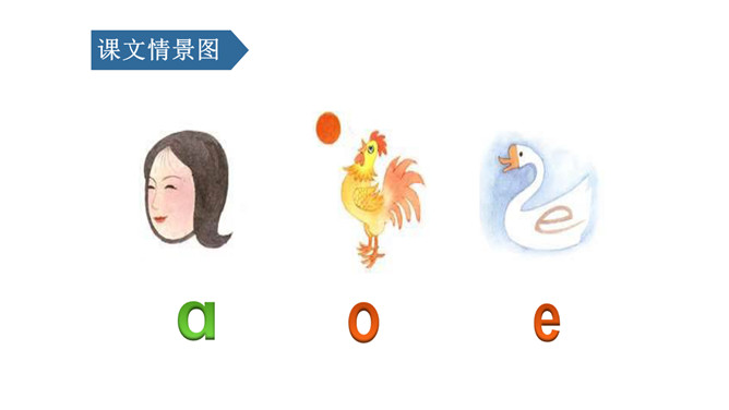 课文情景图。图上画的是什么?在什么地方?在干什么?大公鸡。大公鸡在oo叫。大白鹅。大白鹅张着嘴巴在ee叫。还有一个小女孩,她跟着一个阿姨到河边看大白鹅。图中画的是谁?一位阿姨的头像。这位阿姨的头像和ɑ很相似。图中画的是谁?它在干什么?一只大公鸡在喔喔打鸣。图中画的是谁?它在干什么?一只大白鹅在ee叫。书写儿歌:拼音格四条线,拼音宝宝住里面,住上格的不顶线,住下格的不贴边,中格写满记心间。所属专题:《aoe》ppt。