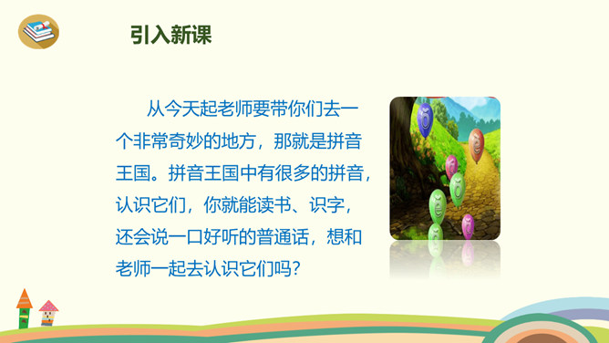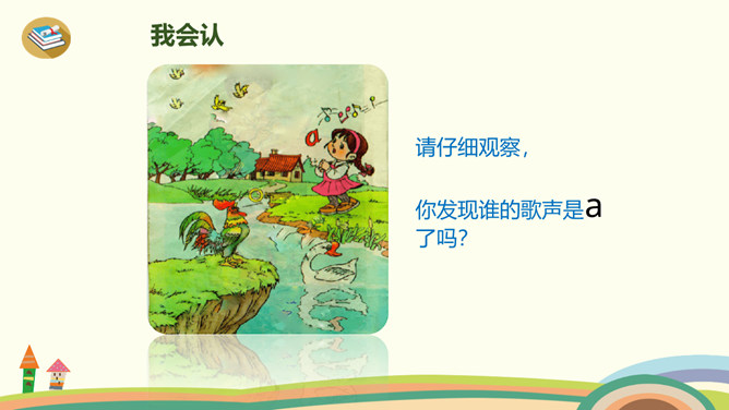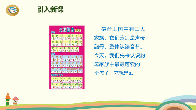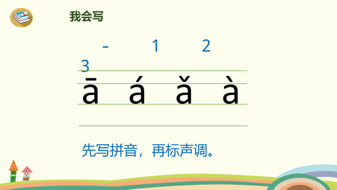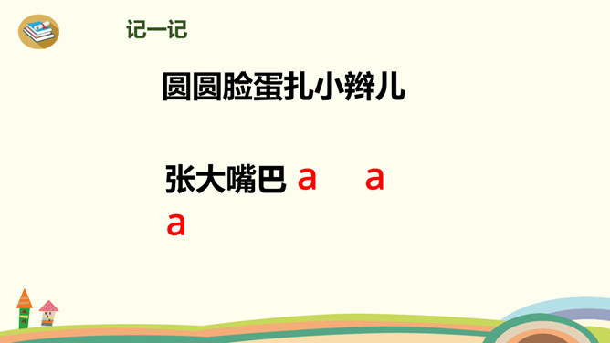 今天起老师要带你们去一个非常奇妙的地方,那就是拼音王国。拼音王国中有很多的拼音,认识它们,你就能读书、识字,还会说一口好听的普通话,想和老师一起去认识它们吗?拼音王国中有三大家族,它们分别是声母、韵母、整体认读音节。今天,我们先来认识韵母家族中最最可爱的一个孩子,它就是a。今天我们认识了拼音王国的三兄弟和他们四种不同的声调。请你把他们带回家,考考你们的父母,看看他们会吗?所属专题:《aoe》ppt。