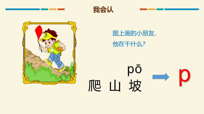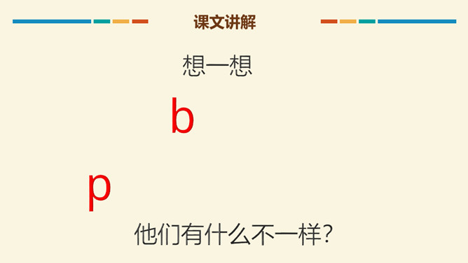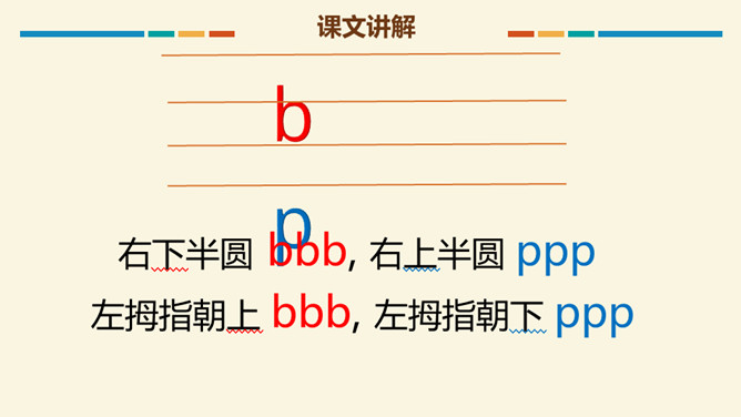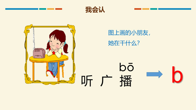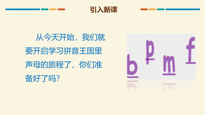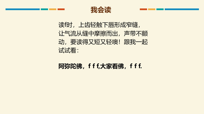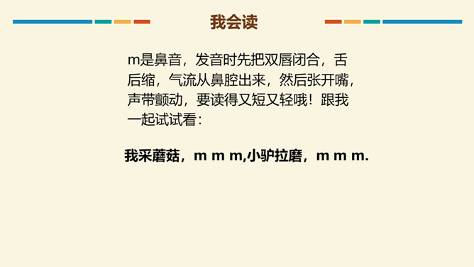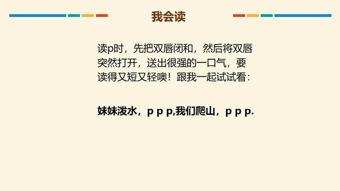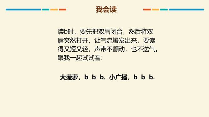 读b时,要先把双唇闭合,然后将双唇突然打开,让气流爆发出来,要读得又短又轻,声带不颤动,也不送气。跟我一起试试看:大菠萝,b b b. 小广播,b b b.读p时,先把双唇闭和,然后将双唇突然打开,送出很强的一口气,要读得又短又轻噢!跟我一起试试看:妹妹泼水,p p p,我们爬山,p p p.m是鼻音,发音时先把双唇闭合,舌后缩,气流从鼻腔出来,然后张开嘴,声带颤动,要读得又短又轻哦!跟我一起试试看。所属专题:《bpmf》ppt。