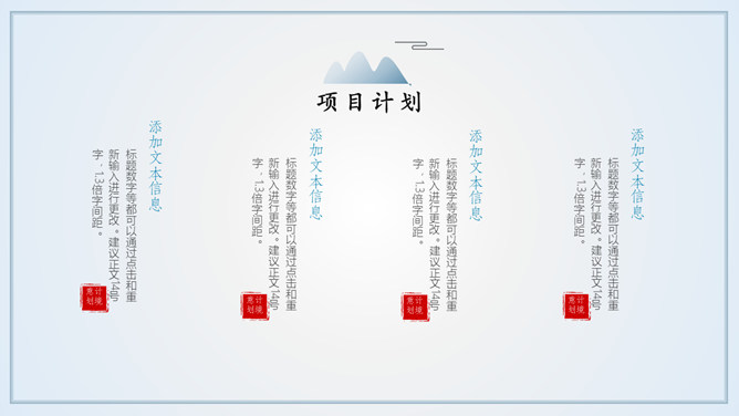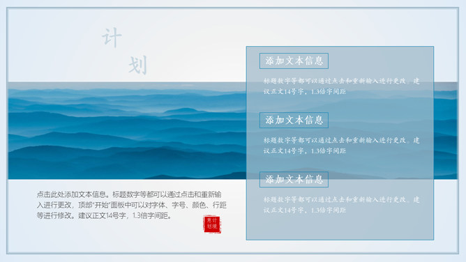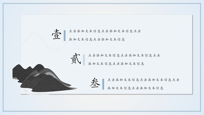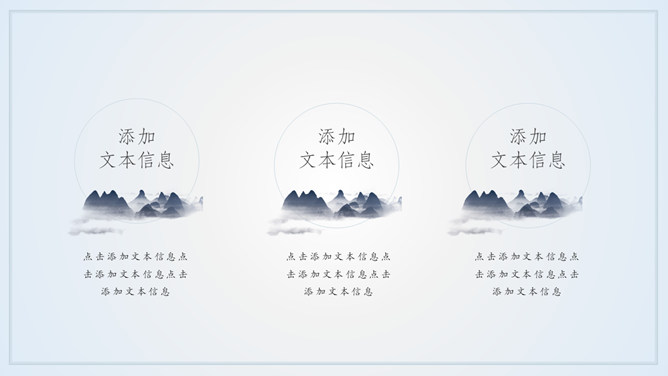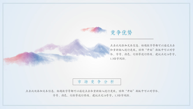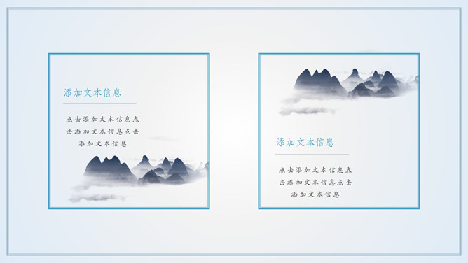 淡雅远山群山国风意境PPT模板。一套简约中国风幻灯片模板,淡雅云雾远山背景,多图文排版页面,动态播放。
