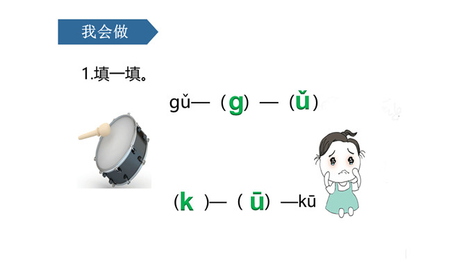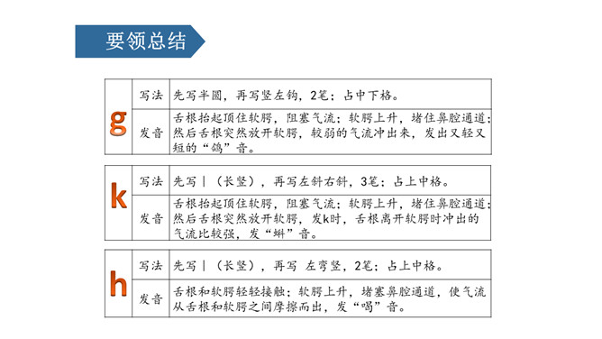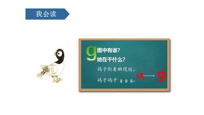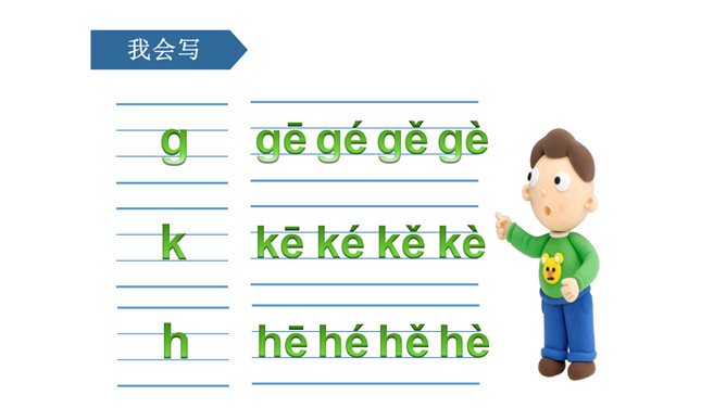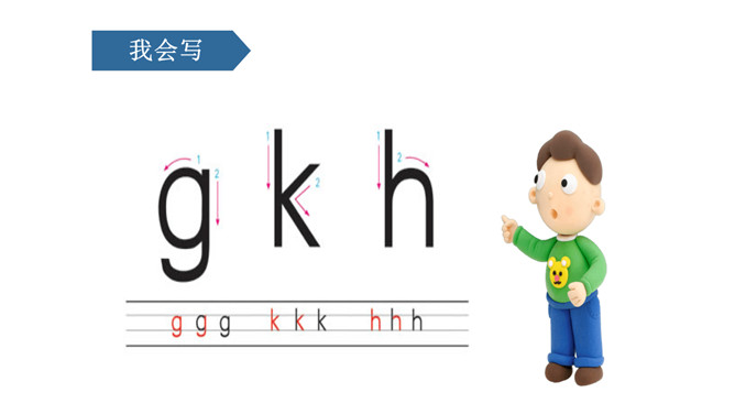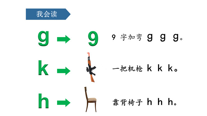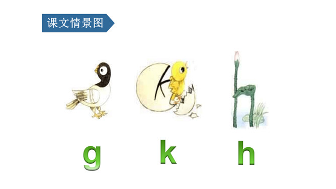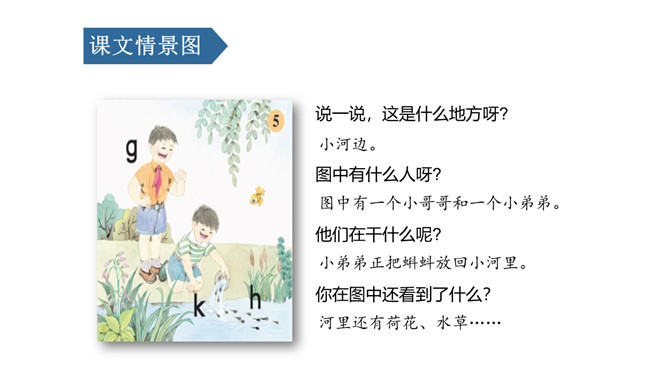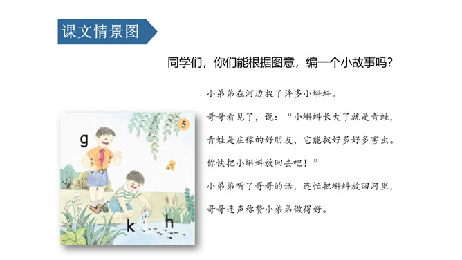 说一说,这是什么地方呀?小河边。图中有什么人呀?图中有一个小哥哥和一个小弟弟。小弟弟正把蝌蚪放回小河里。他们在干什么呢?你在图中还看到了什么?河里还有荷花、水草……同学们,你们能根据图意,编一个小故事吗?同学们,你们能根据图意,编一个小故事吗?h、n比一比,一个举起长手臂,一个弯腰手着地,二人是对好兄弟。鸽子鸽子g g g,小鸡出壳k k k,荷花荷叶h h h。弟弟河边捉蝌蚪,哥哥走来劝阻他。小弟弟,很听话,忙把蝌蚪送回家。9字加弯g g g,竖起机枪k k k,靠背椅子h h h。