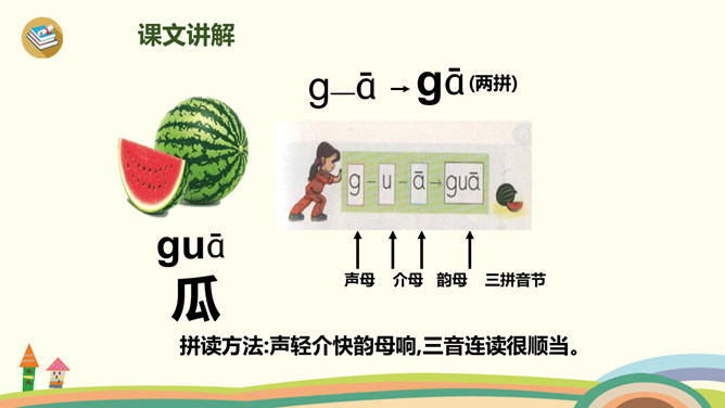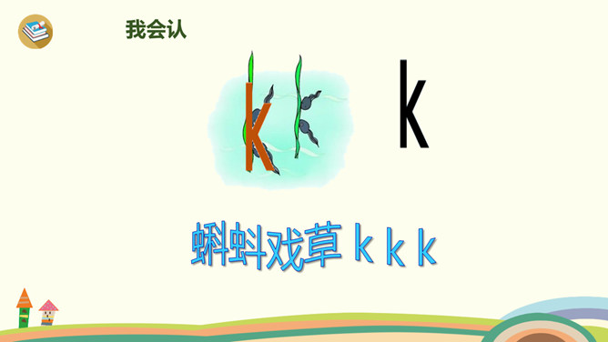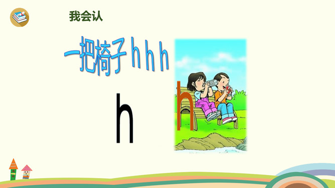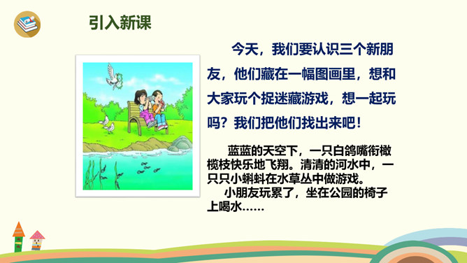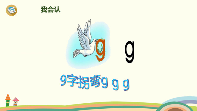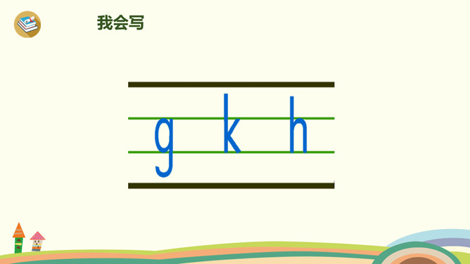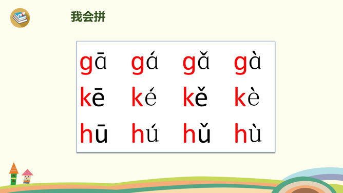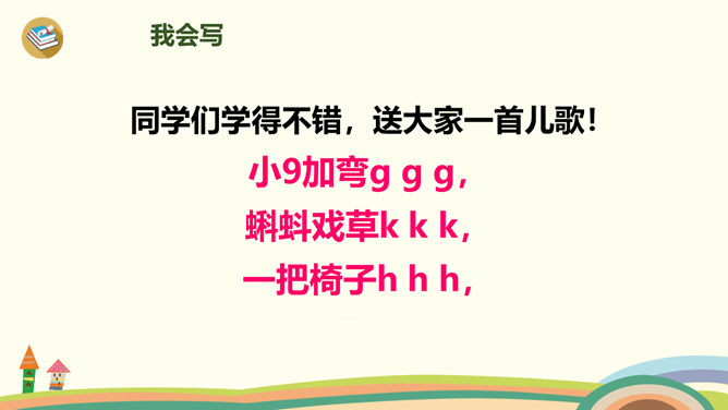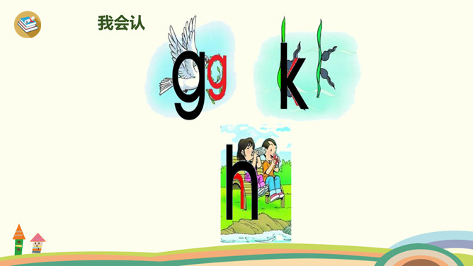 今天,我们要认识三个新朋友,他们藏在一幅图画里,想和大家玩个捉迷藏游戏,想一起玩吗?我们把他们找出来吧!蓝蓝的天空下,一只白鸽嘴衔橄榄枝快乐地飞翔。清清的河水中,一只只小蝌蚪在水草丛中做游戏。小朋友玩累了,坐在公园的椅子上喝水……同学们学得不错,送大家一首儿歌!小9加弯g g g,蝌蚪戏草k k k,一把椅子h h h。声轻介快韵母响,三音连续不中断。课后作业:1、练习书写ɡkh。2、找找“识字表”中,哪些字带声母ɡkh,拼一拼,认一认。所属专题:《gkh》ppt。