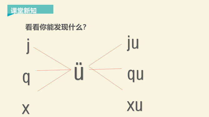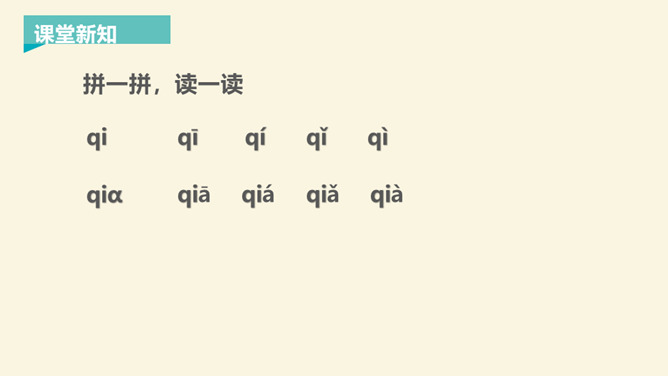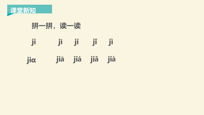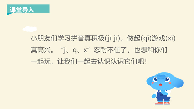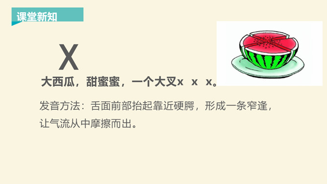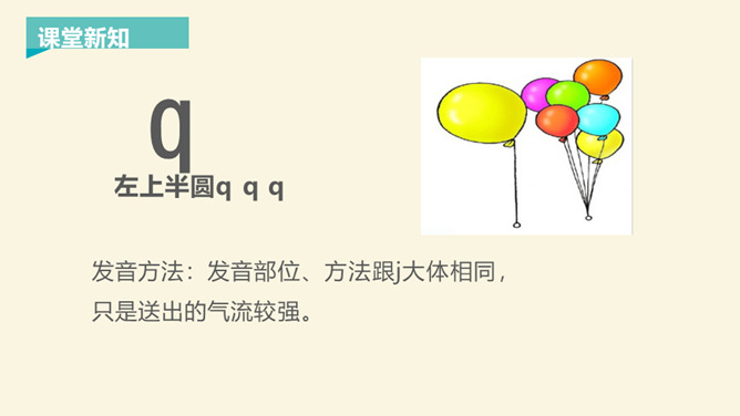 课堂导入:小朋友们学习拼音真积极(jī jí),做起(qǐ)游戏(xì)真高兴。“j、q、x”忍耐不住了,也想和你们一起玩,让我们一起去认识认识它们吧!母鸡抬头j j j。发音方法:舌面前部抬起贴紧硬腭前端,然后再将舌面稍稍离开,与硬腭形成一条窄缝,让气 流挤出来。左上半圆q q q。发音方法:发音部位、方法跟j大体相同,只是送出的气流较强。大西瓜,甜蜜蜜,一个大叉x x x。发音方法:舌面前部抬起靠近硬腭,形成一条窄逢,让气流从中摩擦而出。所属专题:《jqx》ppt。