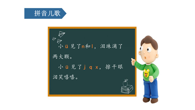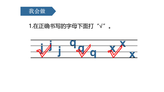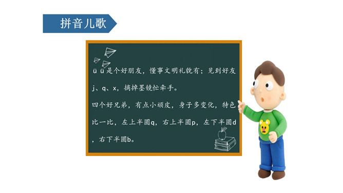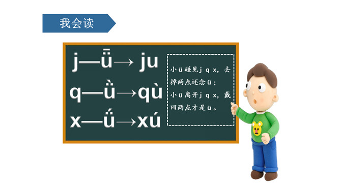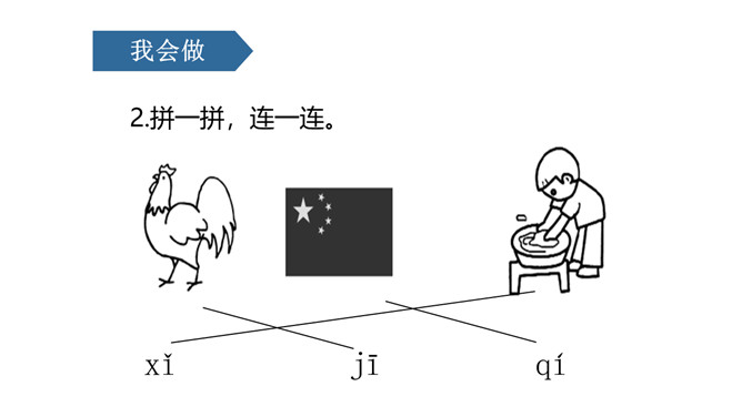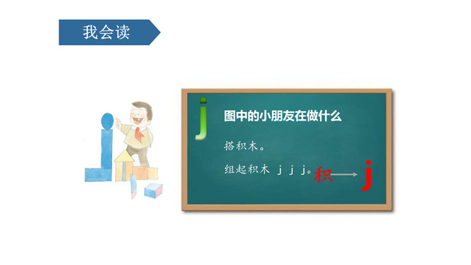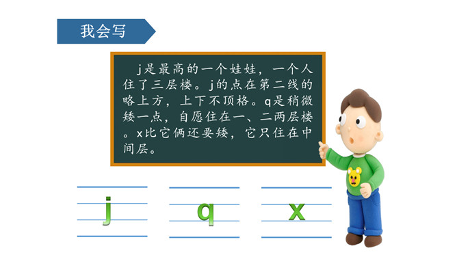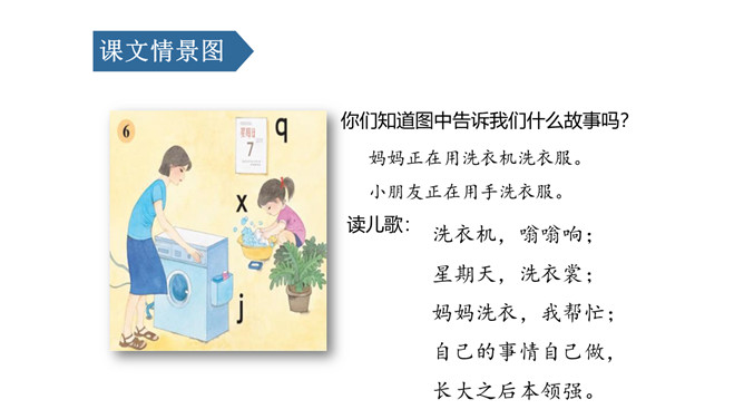 课文情景图:你们知道图中告诉我们什么故事吗?妈妈正在用洗衣机洗衣服。小朋友正在用手洗衣服。读儿歌:洗衣机,嗡嗡响;星期天,洗衣裳;妈妈洗衣,我帮忙;自己的事情自己做,长大之后本领强。j是最高的一个娃娃,一个人住了三层楼。j的点在第二线的略上方,上下不顶格。q是稍微矮一点,自愿住在一、二两层楼。x比它俩还要矮,它只住在中间层。üü是个好朋友,懂事文明礼貌有;见到好友j、q、x,摘掉墨镜忙牵手。四个好兄弟,有点小顽皮,身子多变化,特色比一比,左上半圆q,右上半圆p,左下半圆d,右下半圆b。所属专题:《jqx》ppt。