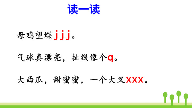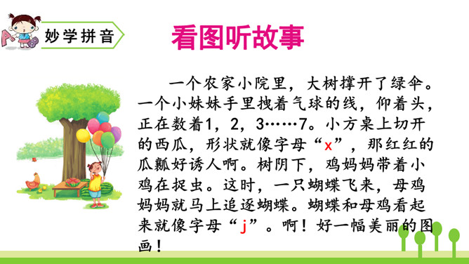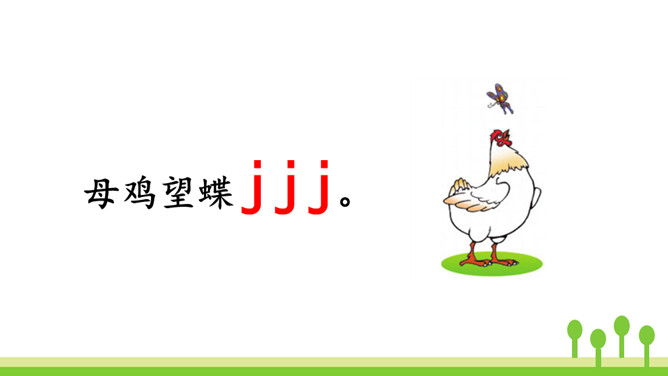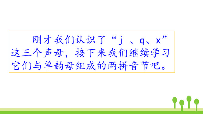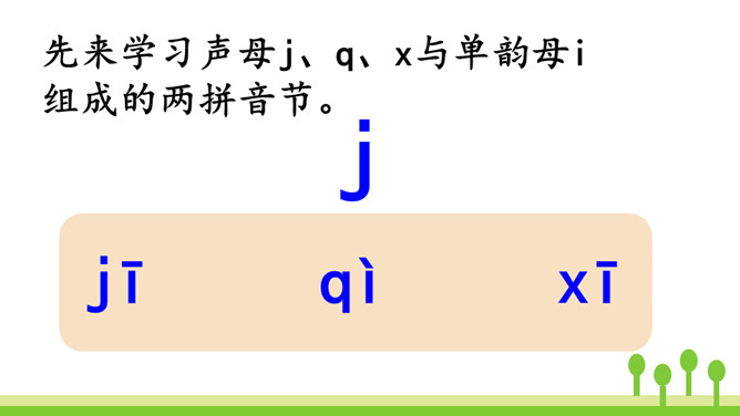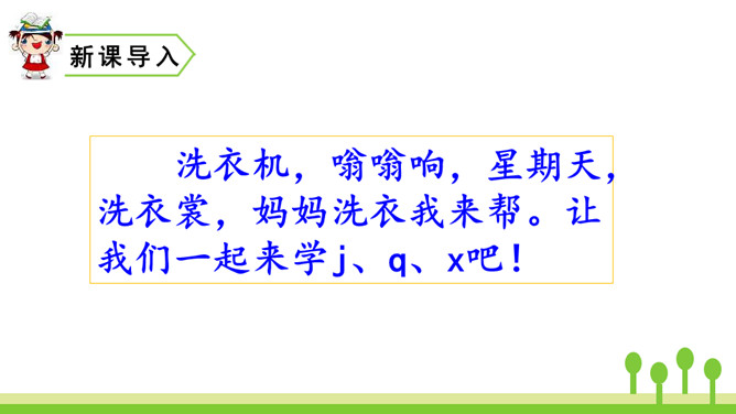 洗衣机,嗡嗡响,星期天,洗衣裳,妈妈洗衣我来帮。让我们一起来学j、q、x吧!想一想:声母j、q、x除了可以和单韵母i组成两拼音节,还可以和哪些单韵母组成两拼音节呢?同样地,由声母为“j、q、x”组成的音节中,不仅有两拼音节,还有三拼音节。汉语拼音的世界是那么丰富多彩,我们怎么能不去看看呢?朗读这首儿歌时,可以把自己想象成和小黄鸡、小黑鸡一起玩耍的其他小鸡,体会做游戏的快乐。其中qǐ、jī、xǐ、xì这4个音节是本课新学的,注意要读准确。所属专题:《jqx》ppt。