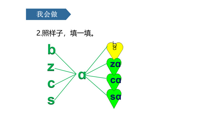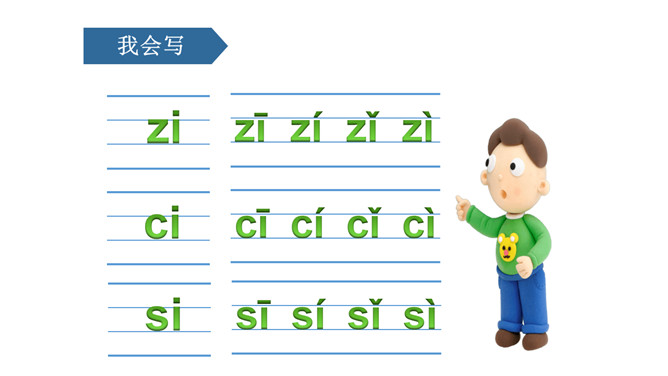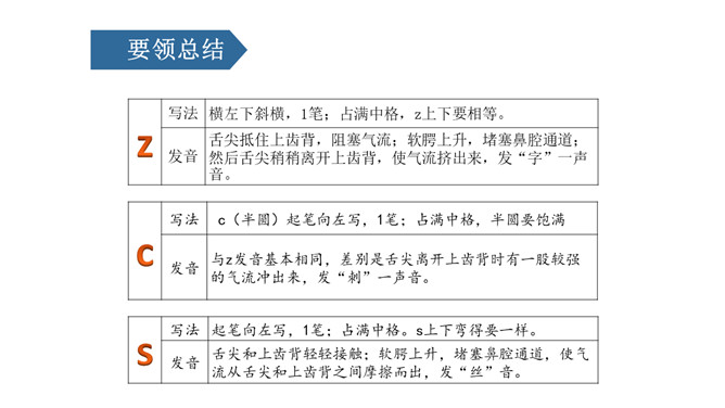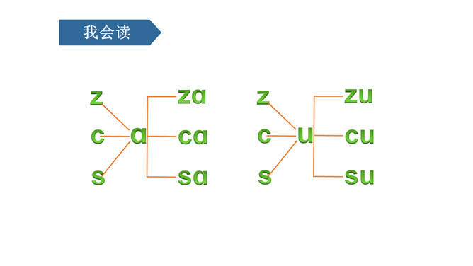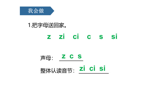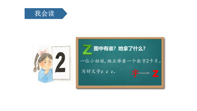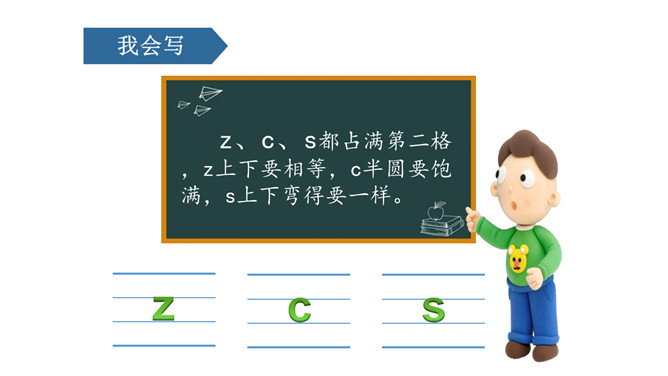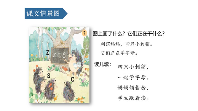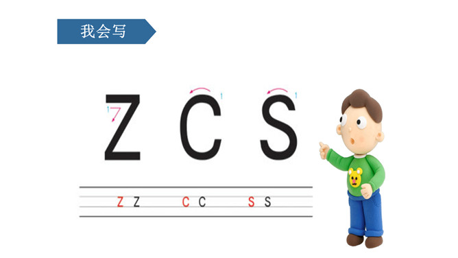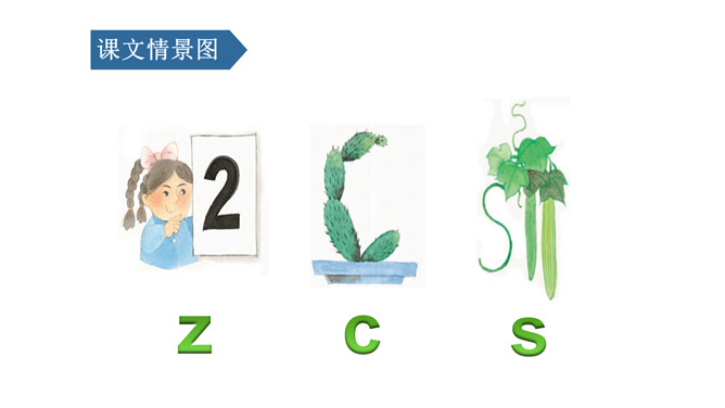 图上画了什么?它们正在干什么?刺猬妈妈,四只小刺猬。它们正在学字母。读儿歌:四只小刺猬,一起学字母。妈妈领着念,学生跟着读。图中有谁?她拿了什么?一位小姑娘,她正举着一个数字2卡片。写好文字z z z。图上画的是什么?用手指比划一下。像C的仙人掌。像个半圆 c c c。同学们,有认识图中显示的是什么吗?两根大丝瓜。丝瓜丝儿 s s s。z、c、s都占满第二格,z上下要相等,c半圆要饱满,s上下弯得要一样。所属专题:《zcs》ppt。