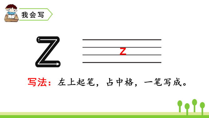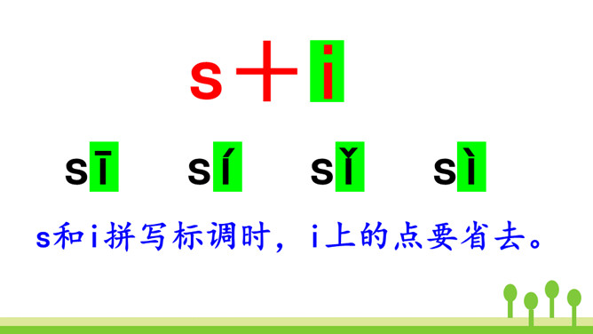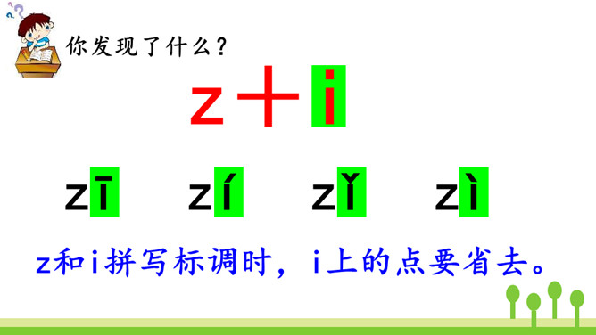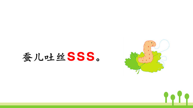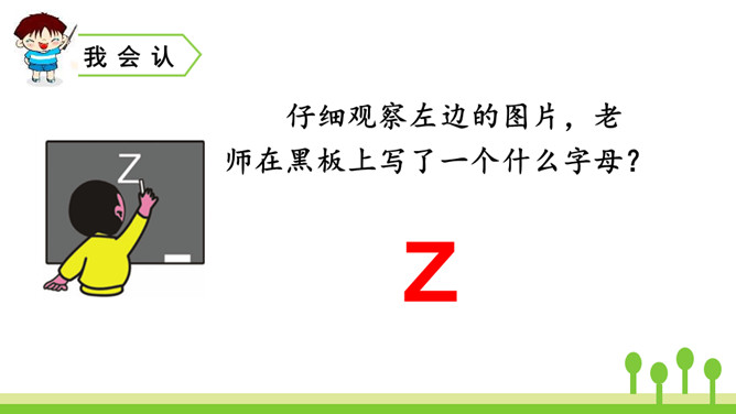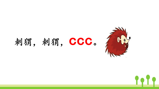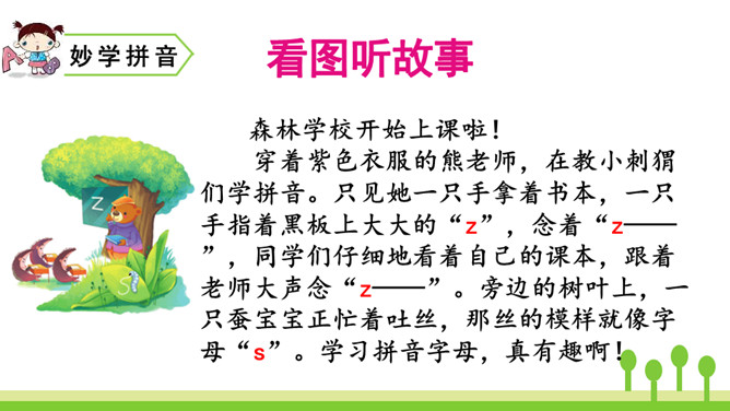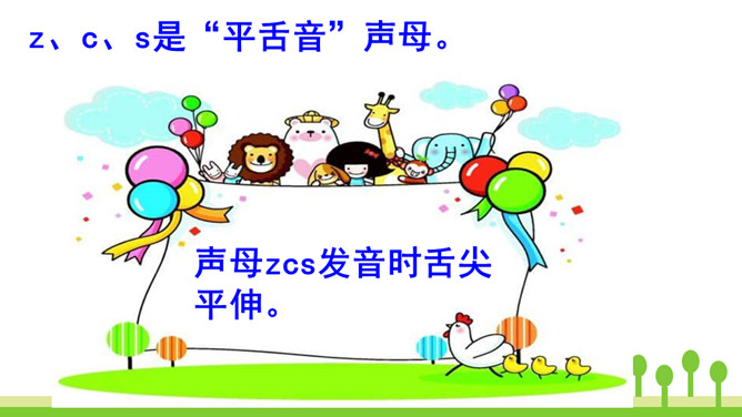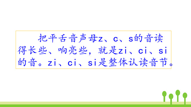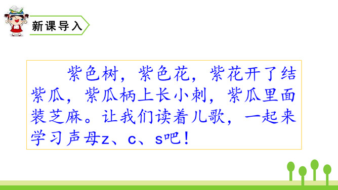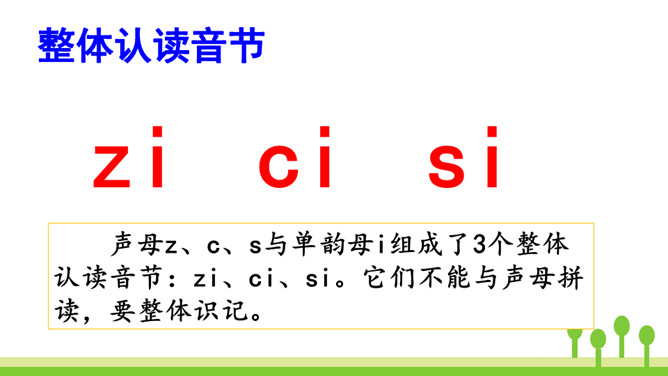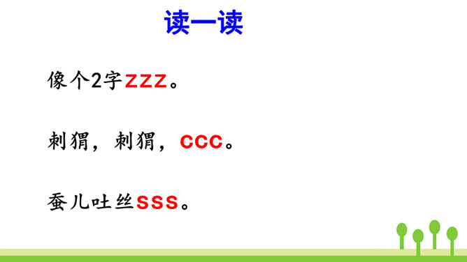 紫色树,紫色花,紫花开了结紫瓜,紫瓜柄上长小刺,紫瓜里面装芝麻。让我们读着儿歌,一起来学习声母z、c、s吧!仔细观察左边的图片,老师在黑板上写了一个什么字母?把平舌音声母z、c、s的音读得长些、响亮些,就是zi、ci、si的音。zi、ci、si是整体认读音节。刚才我们认识了声母“z 、c、s”和它们的整体认读音节“zi、ci、si”,接下来我们继续学习它们与单韵母组成的两拼音节吧。所属专题:《zcs》ppt。