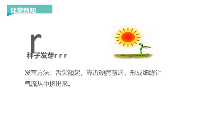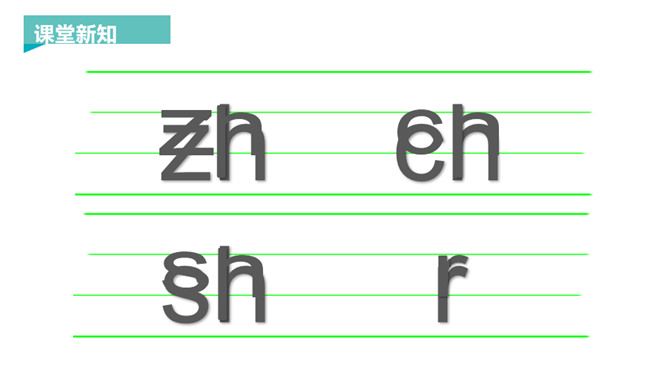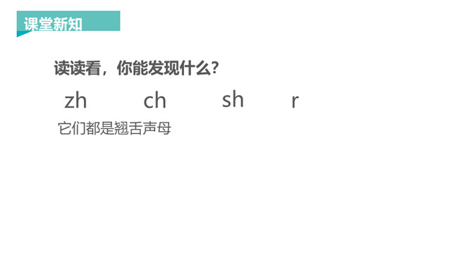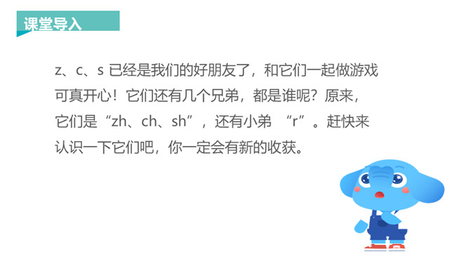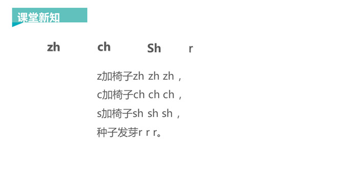 z、c、s 已经是我们的好朋友了,和它们一起做游戏可真开心!它们还有几个兄弟,都是谁呢?原来,它们是“zh、ch、sh”,还有小弟 “r”。赶快来认识一下它们吧,你一定会有新的收获。妈妈织毛衣zh zh zh。发音方法:舌尖向前平伸,抵住上齿背,憋住气,然后舌尖稍稍离开,形成窄缝,让气流从中挤出来。一只刺猬ch ch ch。发音方法:发音部位、方法跟zh 大体相同,只是吐出的气流较强。所属专题:《zh ch sh r》ppt。