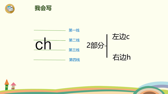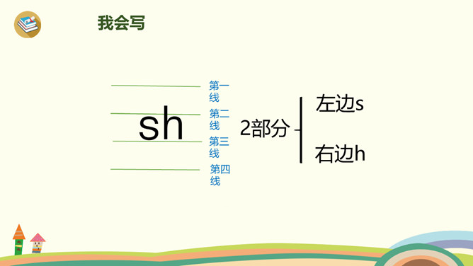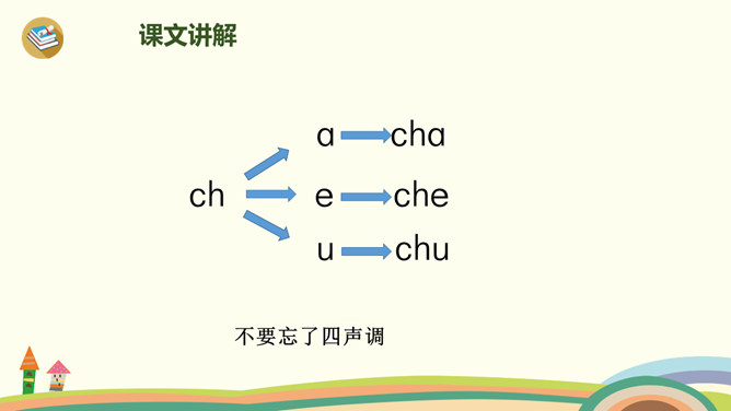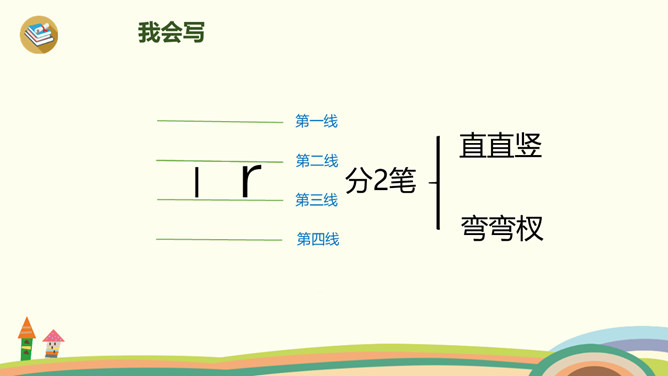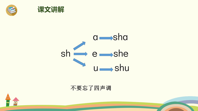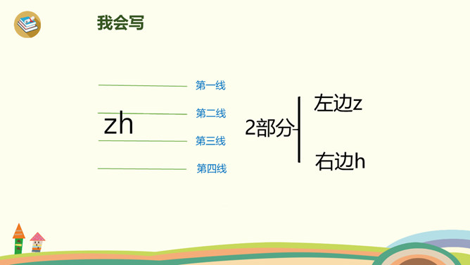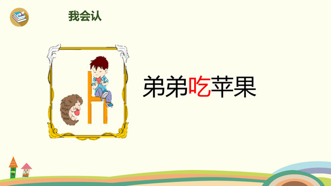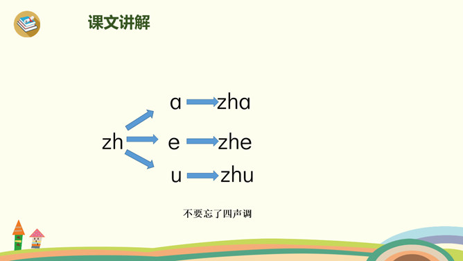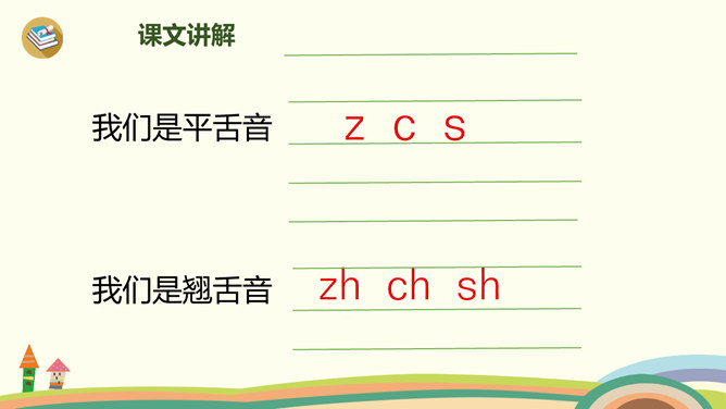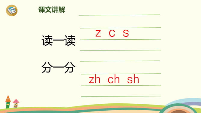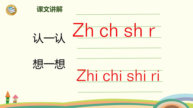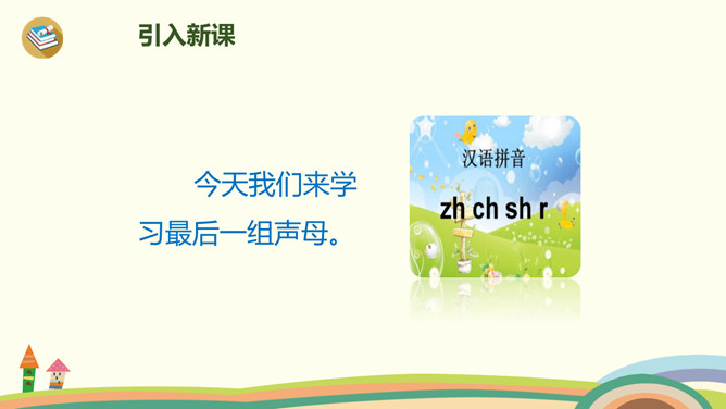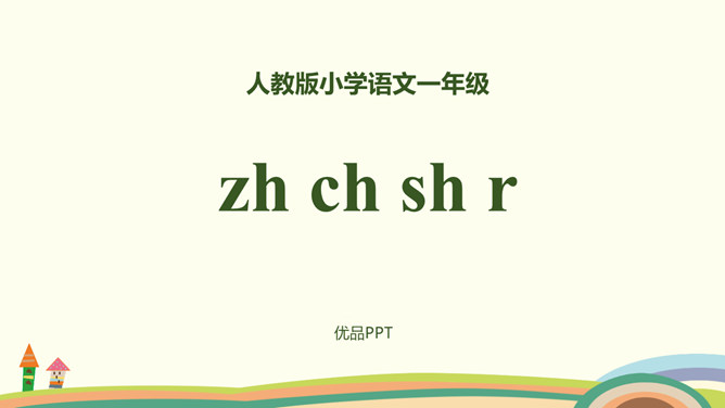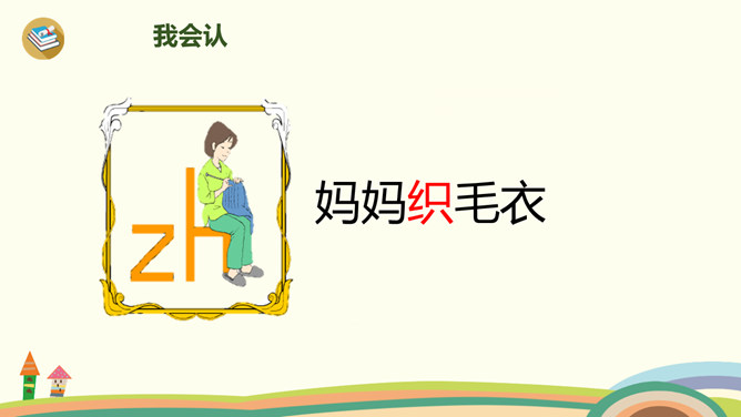 今天我们来学习最后一组声母。妈妈织毛衣。弟弟吃苹果。老师在看书。日光照小苗。找一找1.你能找出哪些是翘舌音,哪些是平舌音吗?2.你能找出绕口令中的整体认读音节吗?课后作业:到今天为止,我们认识了声母家族所有的成员,以及他们与不同单韵母的拼读写。请你把他们带回家,背一背、默一默,看看你们都还记得吗?所属专题:《zh ch sh r》ppt。