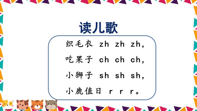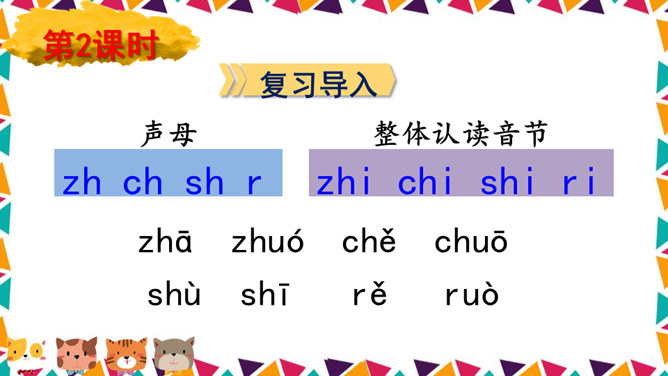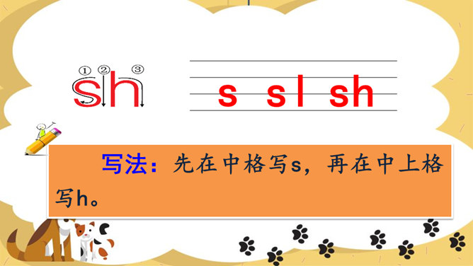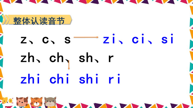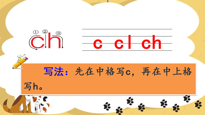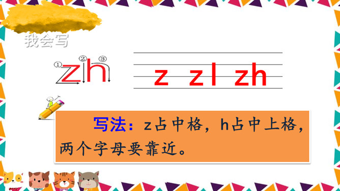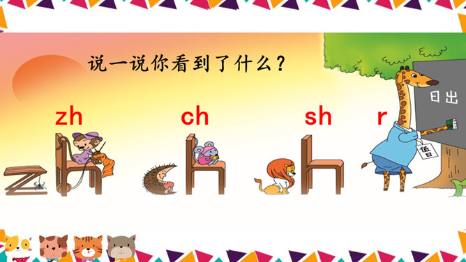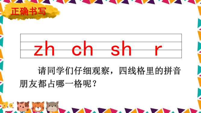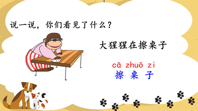 说一说你看到了什么?请同学们仔细观察,四线格里的拼音朋友都占哪一格呢?写法:z占中格,h占中上格,两个字母要靠近。写法:先在中格写c,再在中上格写h。写法:先在中格写s,再在中上格写h。写法:r占中格,短竖写中间,右上一小弯。说一说,你们看见了什么?大猩猩在擦桌子。声母 zh、ch、sh。整体认读音节 zhi、chi、shi。所属专题:《zh ch sh r》ppt。