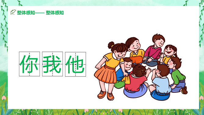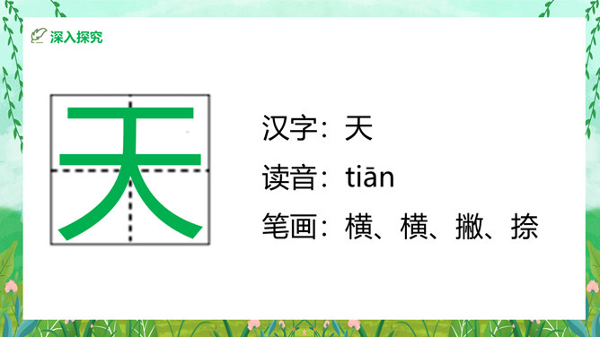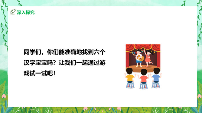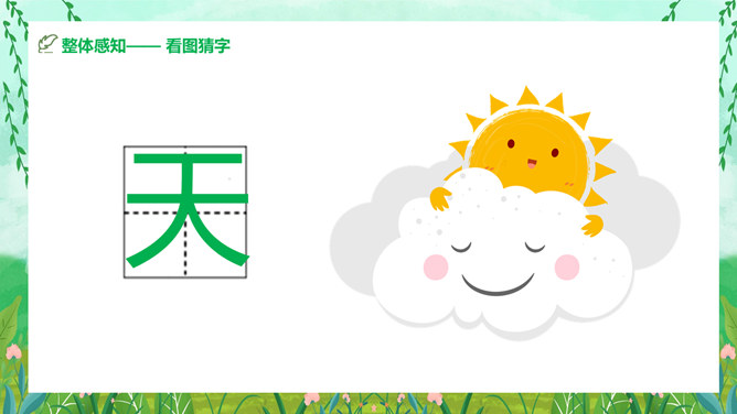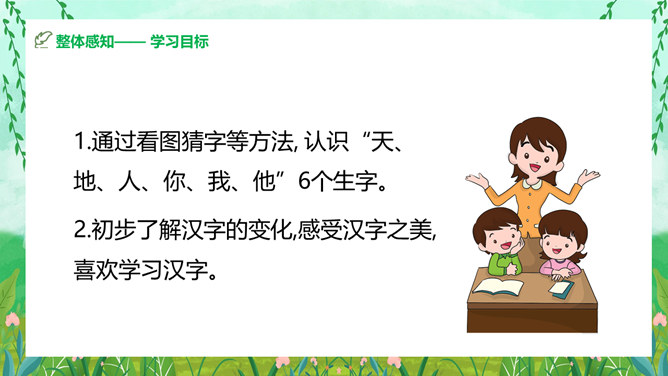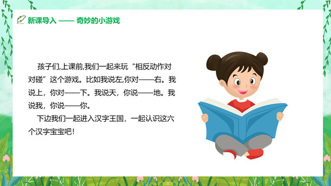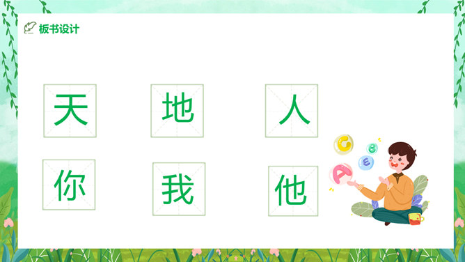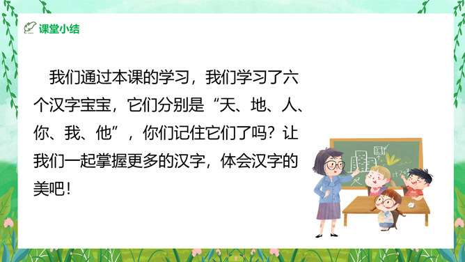 孩子们,上课前,我们一起来玩“相反动作对对碰”这个游戏。比如我说左,你对——右。我说上,你对——下。我说天,你说——地。我说我,你说——你。下边我们一起进入汉字王国,一起认识这六个汉字宝宝吧!1.通过看图猜字等方法, 认识“天、地、人、你、我、他”6个生字。2.初步了解汉字的变化,感受汉字之美,喜欢学习汉字。同学们,你们能准确地找到六个汉字宝宝吗?让我们一起通过游戏试一试吧!所属专题:天地人ppt。