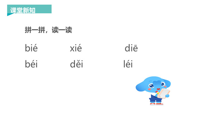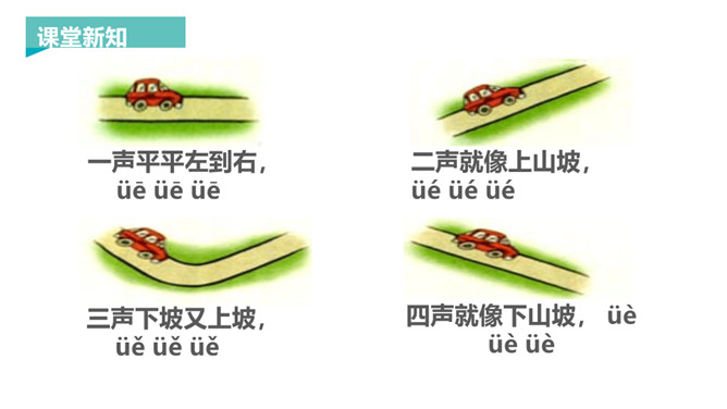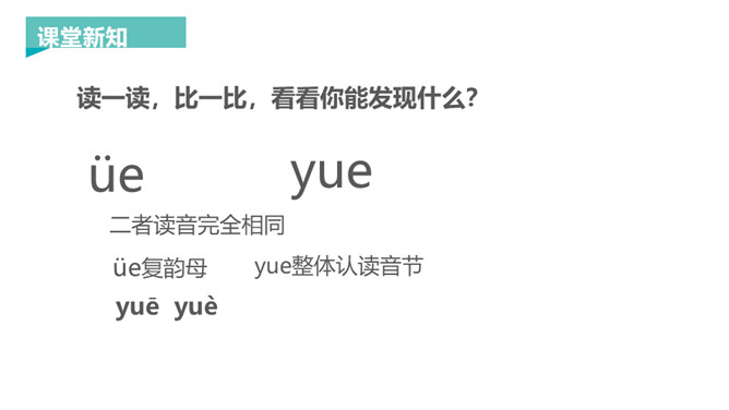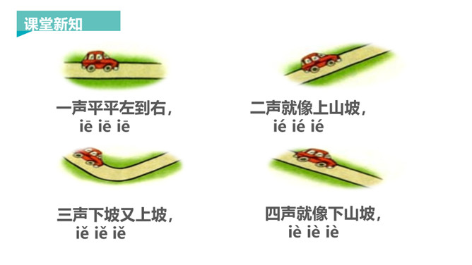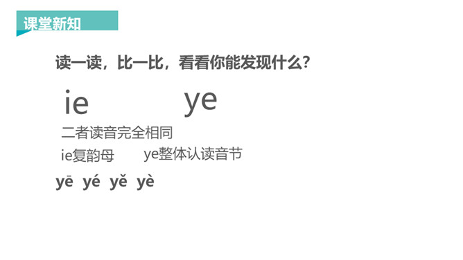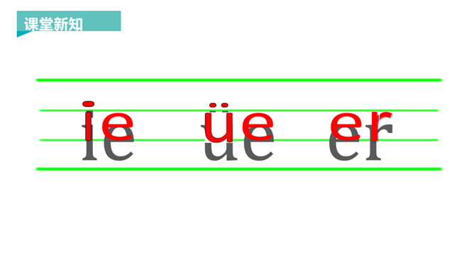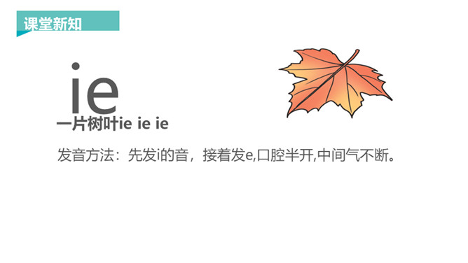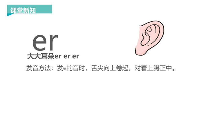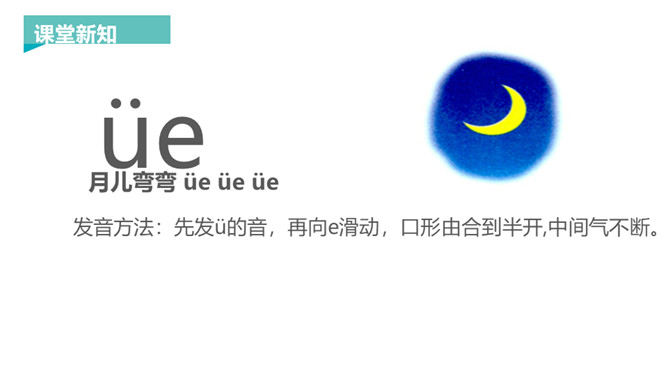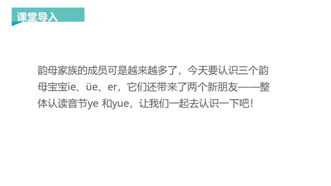韵母家族的成员可是越来越多了,今天要认识三个韵母宝宝ie、üe、er,它们还带来了两个新朋友——整体认读音节ye 和yue,让我们一起去认识一下吧!一片树叶ie ie ie,发音方法:先发i的音,接着发e,口腔半开,中间气不断。 读一读,比一比,看看你能发现什么?月儿弯弯 üe üe üe,发音方法:先发ü的音,再向e滑动,口形由合到半开,中间气不断。 大大耳朵er er er,发音方法:发e的音时,舌尖向上卷起,对着上腭正中。所属专题:《ie üe er》ppt。