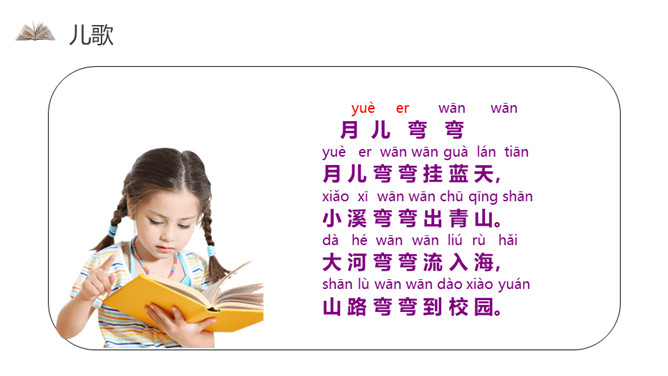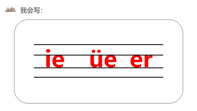 üe前加大y ,两点要省略。月 儿 弯 弯 挂 蓝 天, 小 溪 弯 弯 出 青 山。 大 河 弯 弯 流 入 海,山 路 弯 弯 到 校 园。照样子写一写。拼一拼,你发现了什么?所属专题:《ie üe er》ppt。