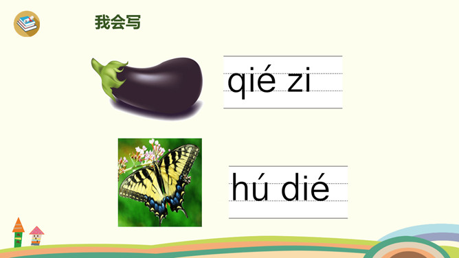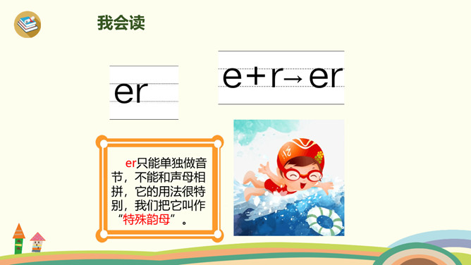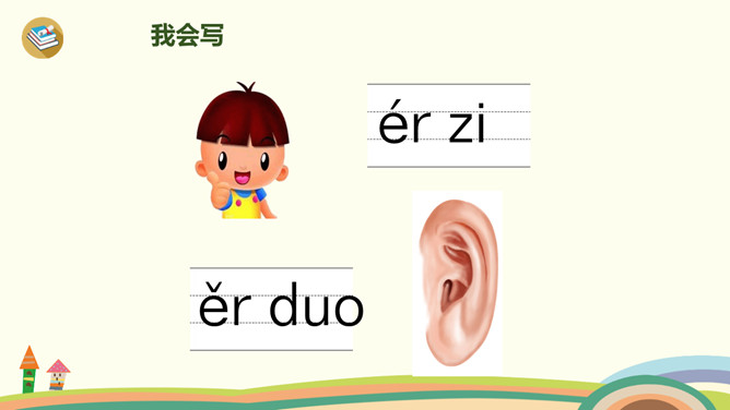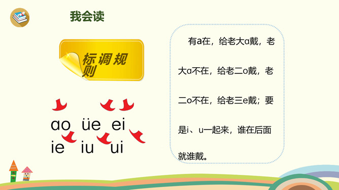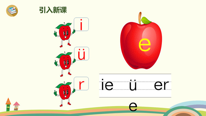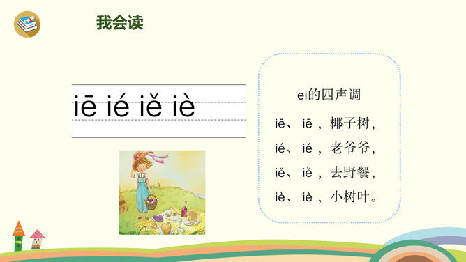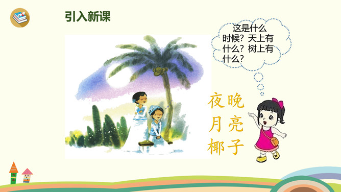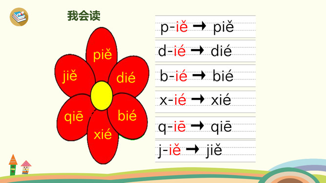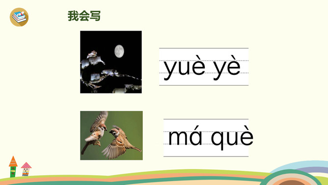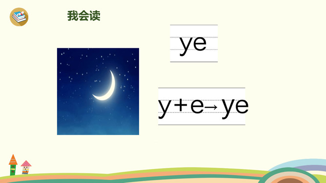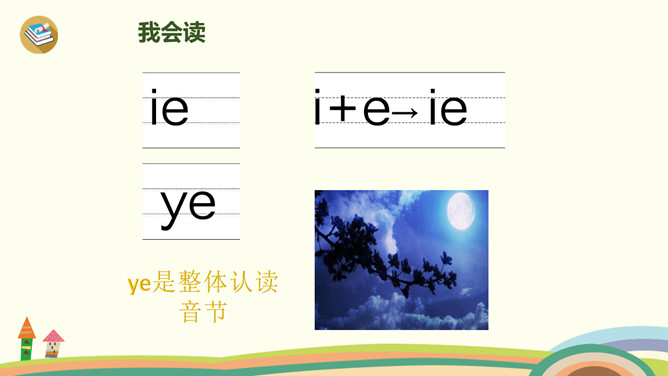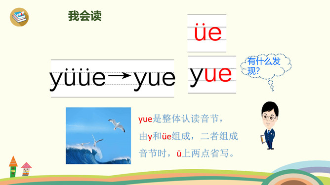这是什么时候?天上有什么?树上有什么?yue是整体认读音节,由y和üe组成,二者组成音节时,ü上两点省写。er只能单独做音节,不能和声母相拼,它的用法很特别,我们把它叫作“特殊韵母”。同桌拍手读一读儿歌,注意拍手和朗读的节奏。读一读,哪些字是我们学过的?月、天、小、山、大,儿歌里面写的是什么时间?夜晚。你能用这两个句式分别说话吗?“什么弯弯去哪里”、“什么弯弯在干什么”。所属专题:《ie üe er》ppt。