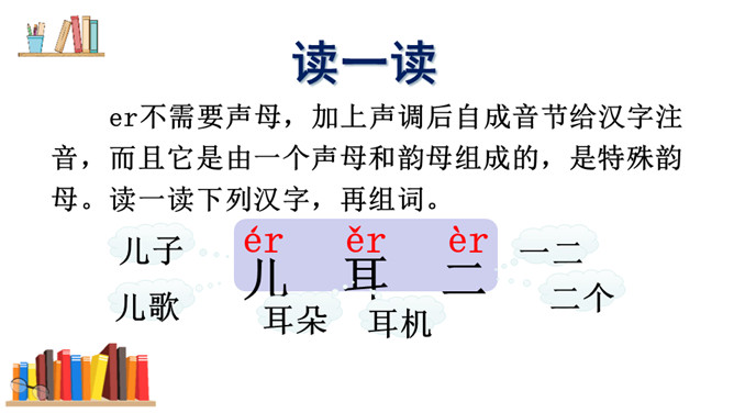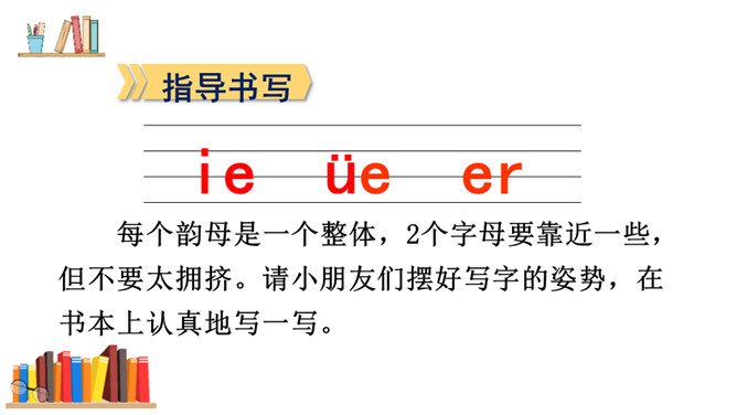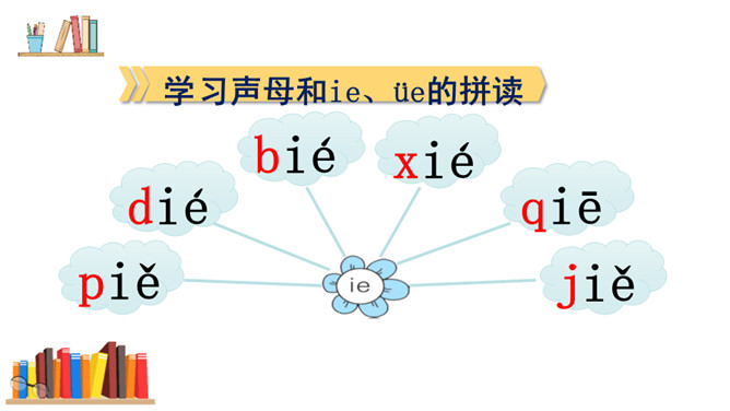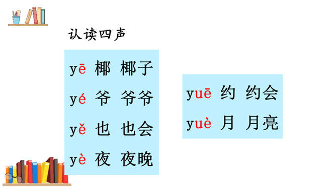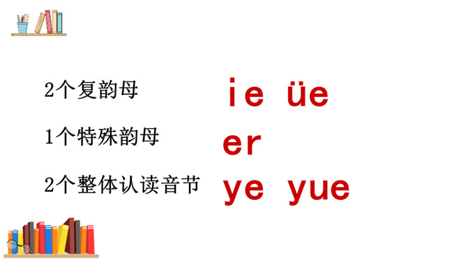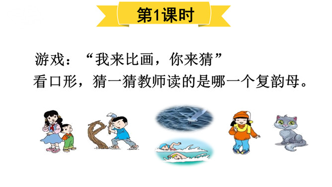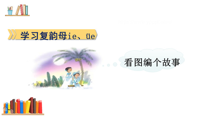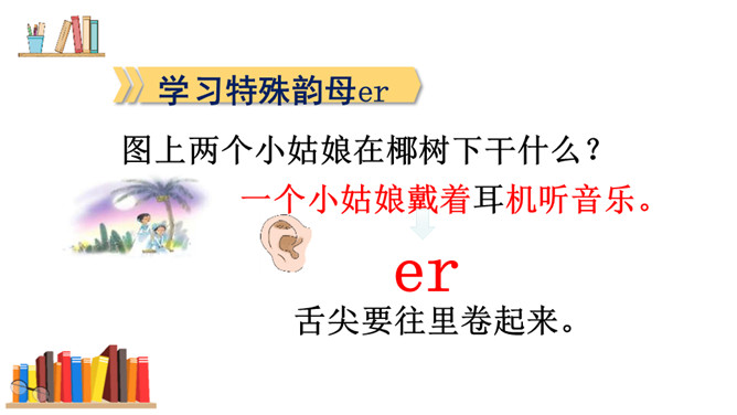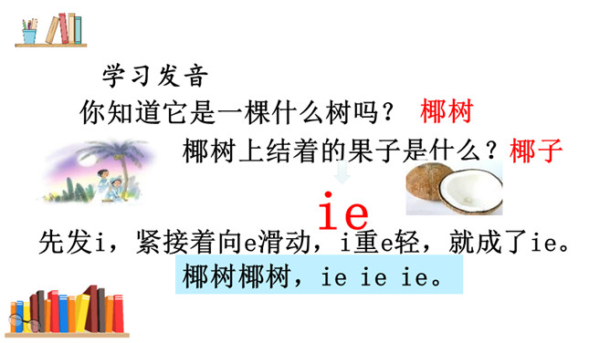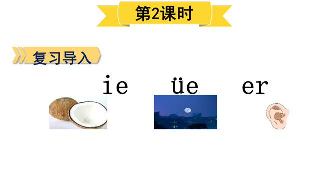 游戏:“我来比画,你来猜”。看口形,猜一猜教师读的是哪一个复韵母。你知道它是一棵什么树吗?椰树上结着的果子是什么?这个夜晚多么安静,天上挂着一轮明亮的月亮,她给大家带来一个朋友呢!将“月”的第四声去掉,就是üe的发音。图上两个小姑娘在椰树下干什么?一个小姑娘戴着耳机听音乐。er不需要声母,加上声调后自成音节给汉字注音,而且它是由一个声母和韵母组成的,是特殊韵母。读一读下列汉字,再组词。所属专题:《ie üe er》ppt。