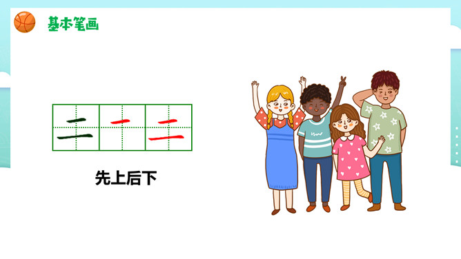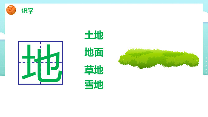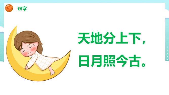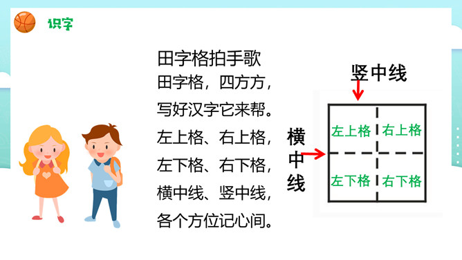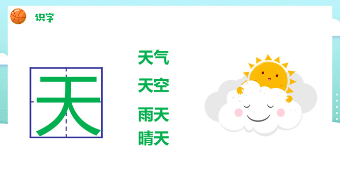 一二三四五,金木水火土。田字格,四方方,写好汉字它来帮。左上格、右上格。金木水火土。天地分上下,日月照今古。天气 天空 雨天 晴天。土地 地面 草地 雪地。所属专题: