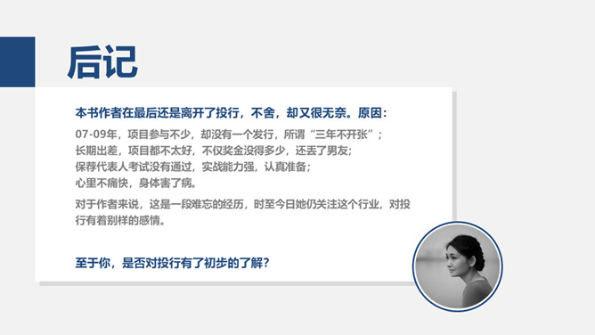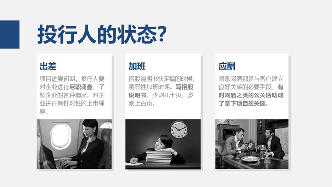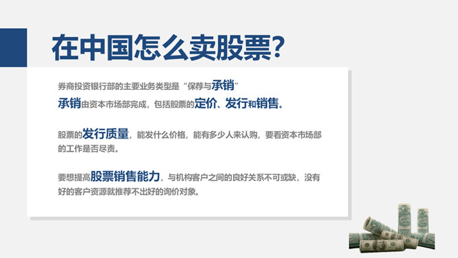 《亲历投行-中国投行的若干传言与真相》PPT读书笔记。到底什么是投行?投行就是帮助未上市的企业上市或者帮助已上市的企业募股等相关事宜的机构。