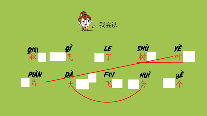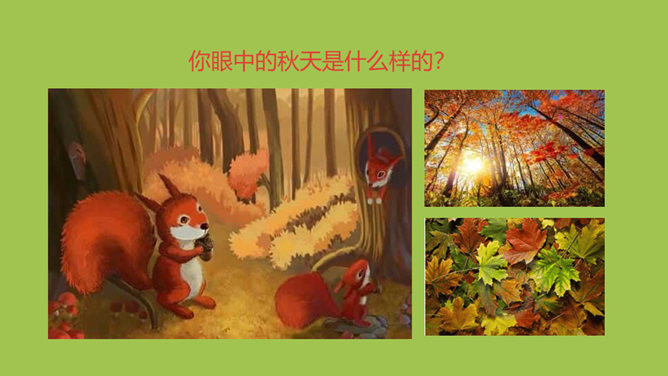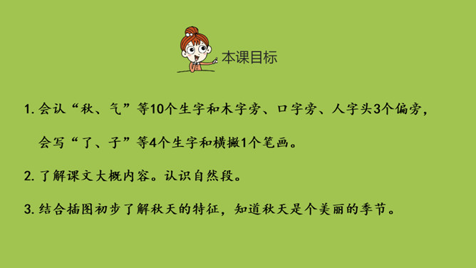 1.会认“秋、气”等10个生字和木字旁、口字旁、人字头3个偏旁,会写“了、子”等4个生字和横撇1个笔画。 2.了解课文大概内容。认识自然段。3.结合插图初步了解秋天的特征,知道秋天是个美丽的季节。你眼中的秋天是什么样的?课文一共有几个自然段?全文一共有三个自然段。课文一共介绍了秋天的几种事物?天气 树叶 天空 大雁 。什么是自然段?是文章表达意思的基本单位。每个自然段前面都有两个空格。所属专题:秋天ppt。