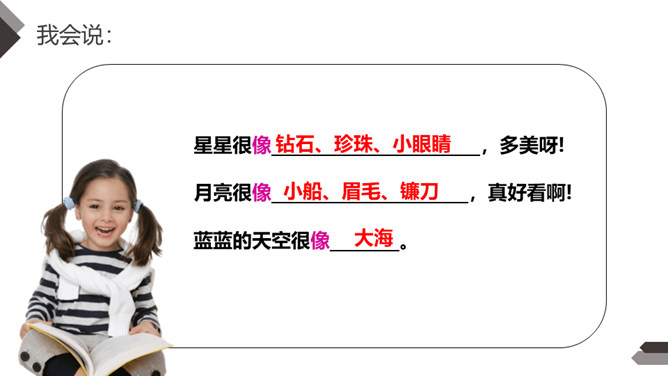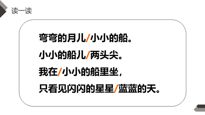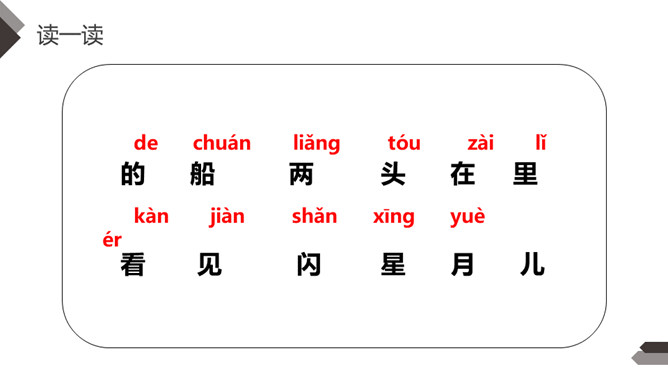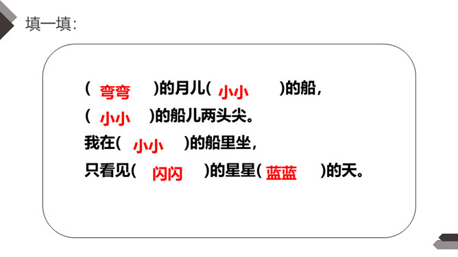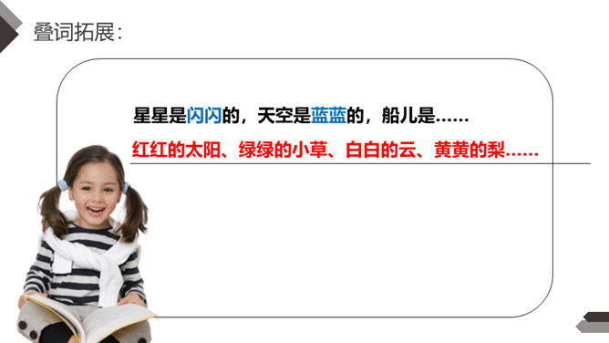 猜谜语:有时落在山腰,有时挂在树梢。有时像个圆盘,有时像把镰刀。请同学们选择自己喜欢的方式,借助拼音自由地朗读课文,读准字音,做到正确、流利、有感情,并把不认识的字圈出来,问问周围的同学。 星星是闪闪的,天空是蓝蓝的,船儿是……红红的太阳、绿绿的小草、白白的云、黄黄的梨……所属专题:小小的船ppt。