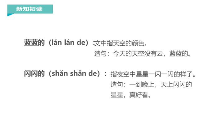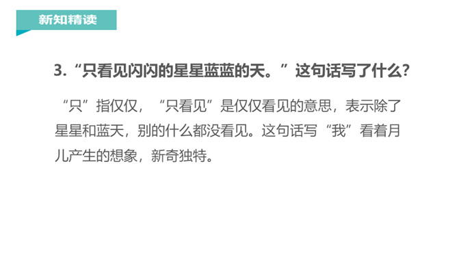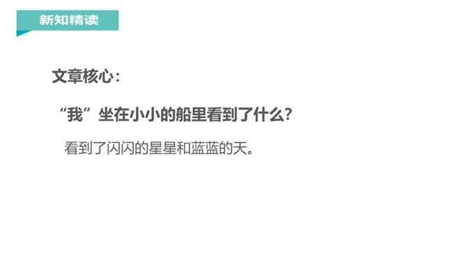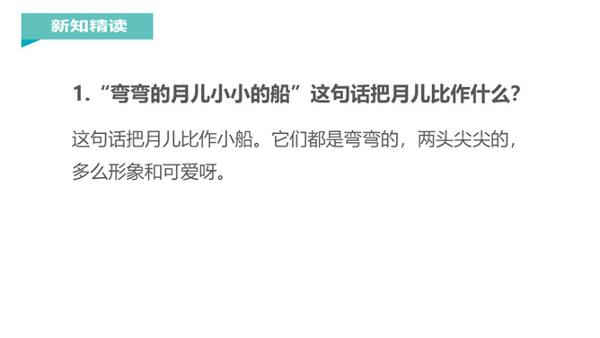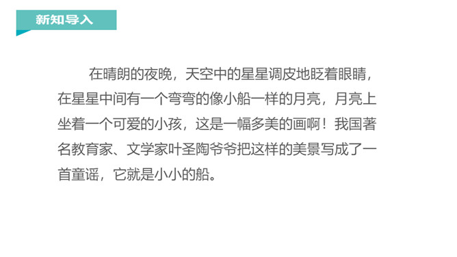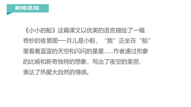 在晴朗的夜晚,天空中的星星调皮地眨着眼睛,在星星中间有一个弯弯的像小船一样的月亮,月亮上坐着一个可爱的小孩,这是一幅多美的画啊!我国著名教育家、文学家叶圣陶爷爷把这样的美景写成了一首童谣,它就是小小的船。1.“弯弯的月儿小小的船”这句话把月儿比作什么?这句话把月儿比作小船。它们都是弯弯的,两头尖尖的,多么形象和可爱呀。2.“小小的船儿两头尖。”这句话写了小船的什么?你觉得月儿还像什么呢?所属专题:小小的船ppt。