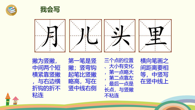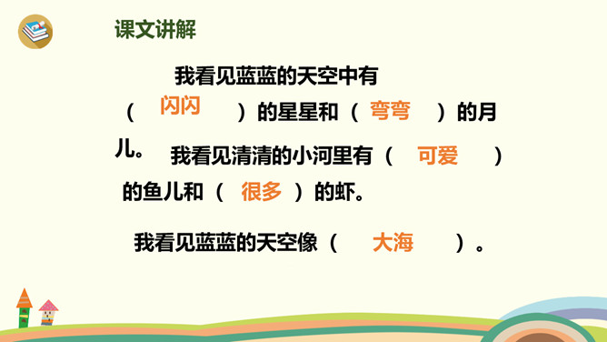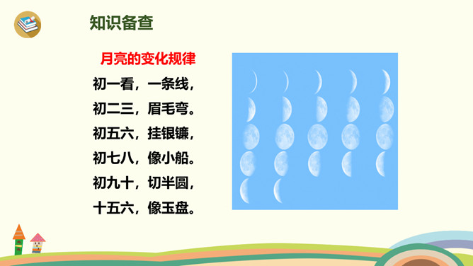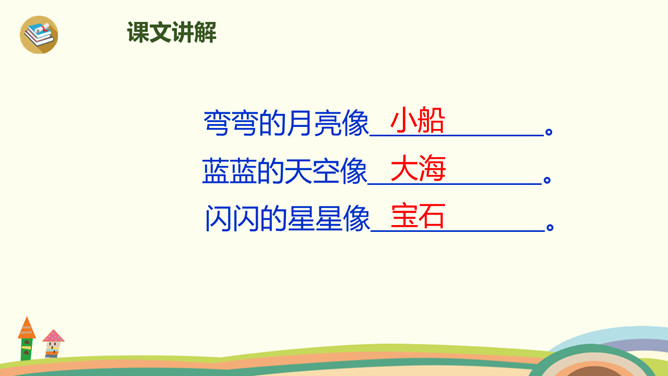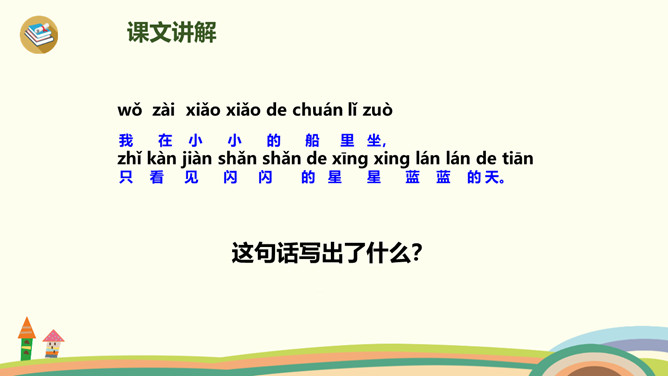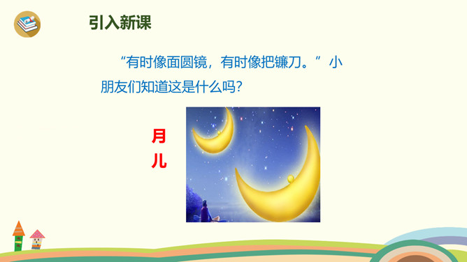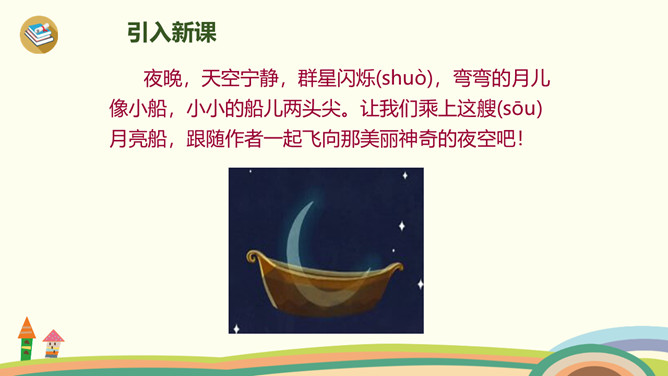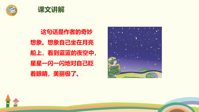 有时像面圆镜,有时像把镰刀。”小朋友们知道这是什么吗?夜晚,天空宁静,群星闪烁(shuò),弯弯的月儿像小船,小小的船儿两头尖。让我们乘上这艘(sōu)月亮船,跟随作者一起飞向那美丽神奇的夜空吧!这句话是作者的奇妙想象。想象自己坐在月亮船上,看到蓝蓝的夜空中,星星一闪一闪地对自己眨着眼睛,美丽极了。这首小诗,通过描述月儿的样子以及想象“我”坐在月儿上看到的景物,表达了作者对夜空美景的热爱之情。所属专题:小小的船ppt。