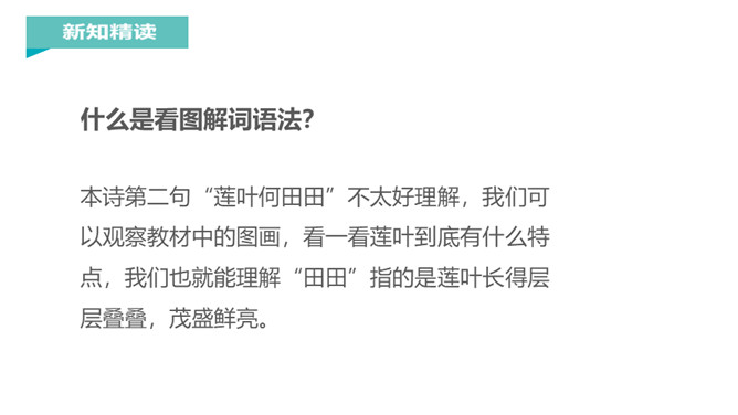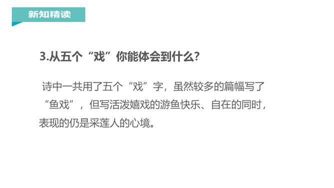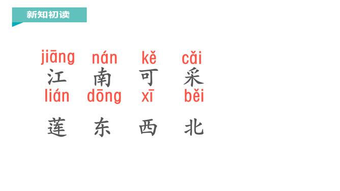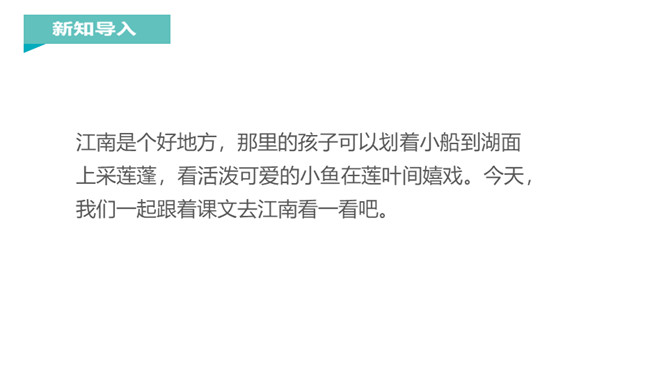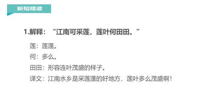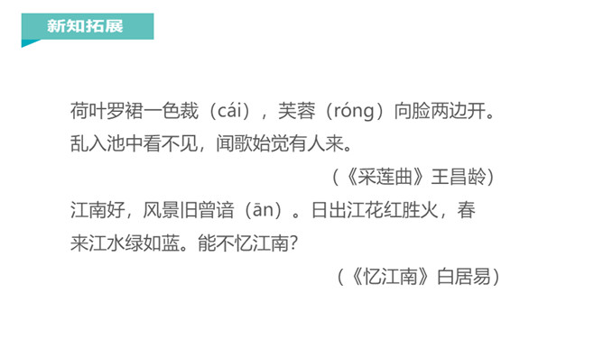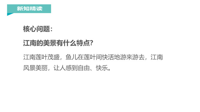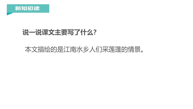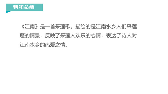 江南是个好地方,那里的孩子可以划着小船到湖面上采莲蓬,看活泼可爱的小鱼在莲叶间嬉戏。今天,我们一起跟着课文去江南看一看吧。说一说课文主要写了什么?本文描绘的是江南水乡人们采莲蓬的情景。莲:莲蓬。何:多么。田田:形容连叶茂盛的样子。译文:江南水乡是采莲蓬的好地方,莲叶多么茂盛啊!《江南》是一首采莲歌,描绘的是江南水乡人们采莲蓬的情景,反映了采莲人欢乐的心情,表达了诗人对江南水乡的热爱之情。所属专题:江南ppt。