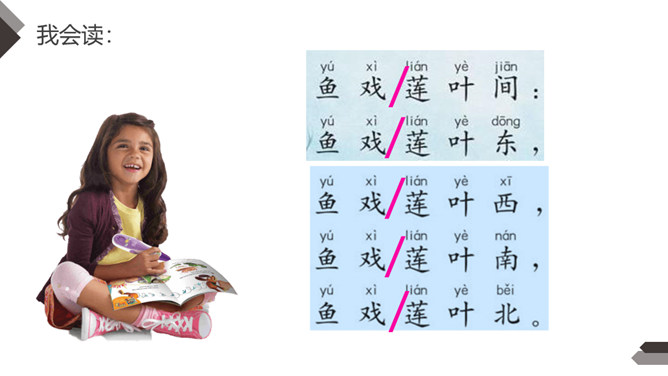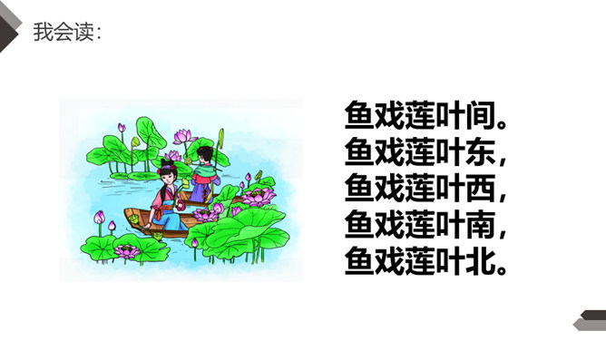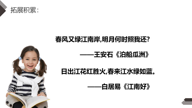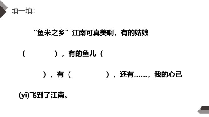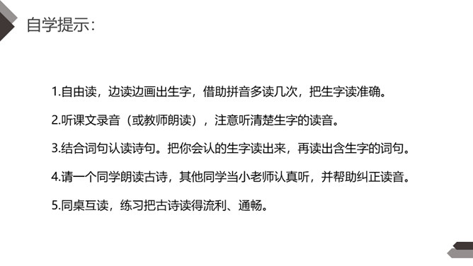 自学提示:1.自由读,边读边画出生字,借助拼音多读几次,把生字读准确。2.听课文录音(或教师朗读),注意听清楚生字的读音。3.结合词句认读诗句。把你会认的生字读出来,再读出含生字的词句。4.请一个同学朗读古诗,其他同学当小老师认真听,并帮助纠正读音。5.同桌互读,练习把古诗读得流利、通畅。读书要求:运用“目视双行”法,正确、流利地朗读古诗,注意节奏,读出诗韵味。所属专题:江南ppt。