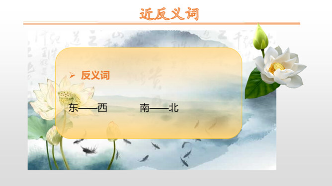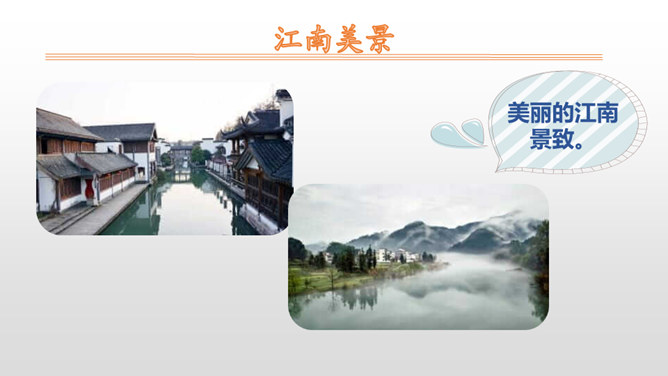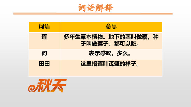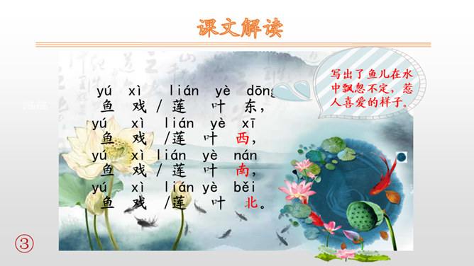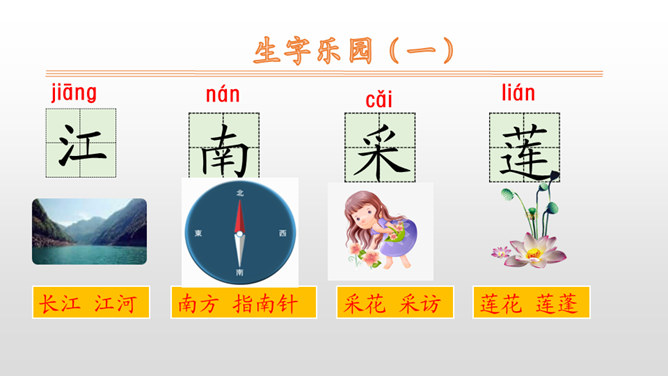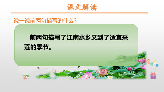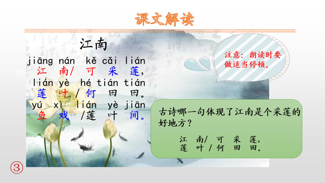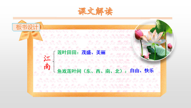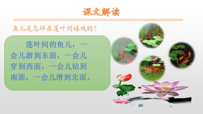 古诗哪一句体现了江南是个采莲的好地方?说一说前两句描写的什么?前两句描写了江南水乡又到了适宜采莲的季节。鱼儿是怎样在莲叶间嬉戏的?莲叶间的鱼儿,一会儿游到东面,一会儿穿到西面,一会儿钻到南面,一会儿滑到北面。首诗描绘了江南采莲的情景,为我们展现了一幅美丽、生动的画卷。朗读时,要读准字音,再结合书中的插图展开想象:莲叶茂盛鲜亮的样子、鱼儿游水的情景以及人们愉悦的心情,体会意境美,再通过读把这种美表达出来。所属专题:江南ppt。