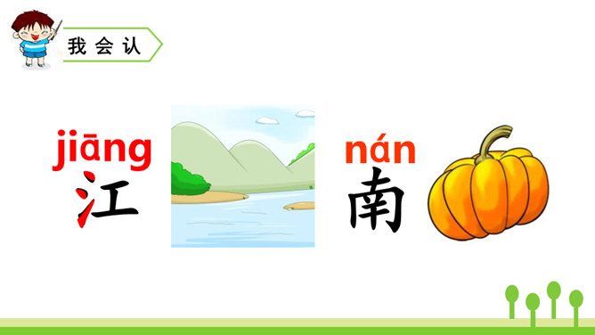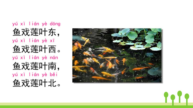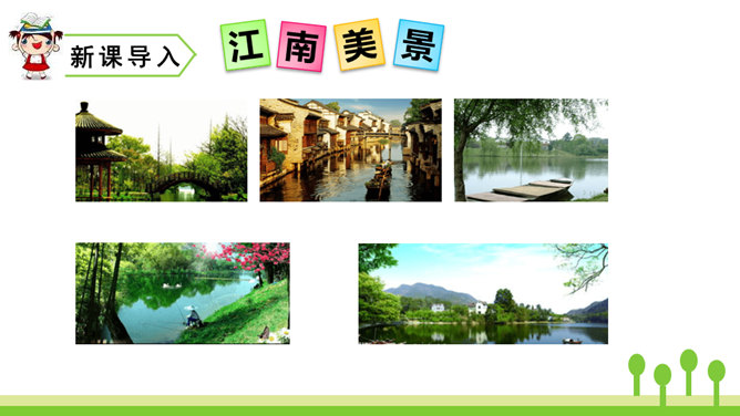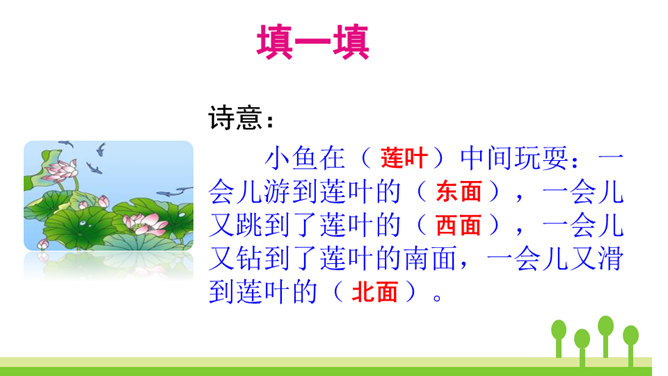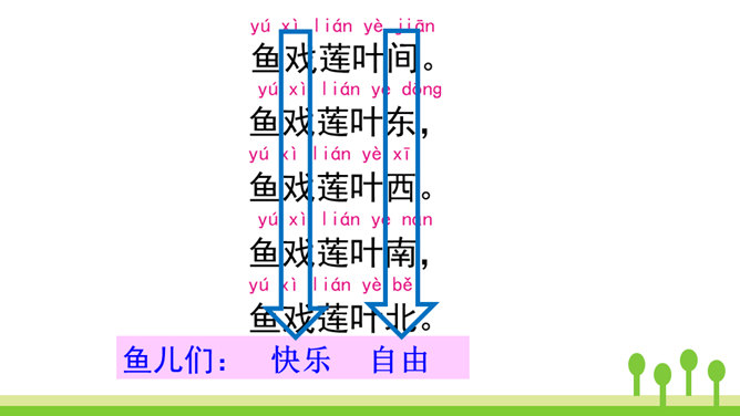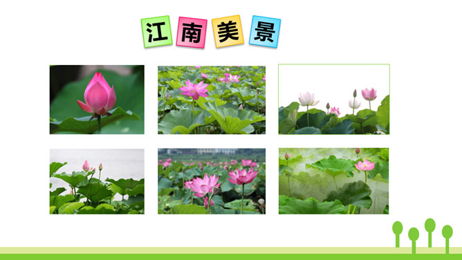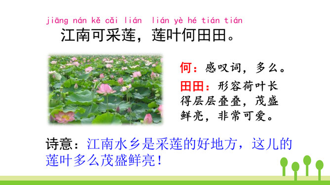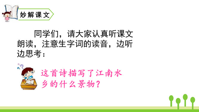 同学们,请大家认真听课文朗读,注意生字词的读音,边听边思考:这首诗描写了江南水乡的什么景物?这首古诗选自《汉乐府》,描写的是江南盛夏的美景:荷塘莲叶茂盛,莲花绽放,鱼儿自由、欢快地在莲叶、莲花下的碧水中尽情玩耍,表达了诗人快乐的心情和对江南水乡的热爱之情。结束语:祖国的江南水乡荷香鱼肥,小桥流水,令人向往。水乡的水多,水乡的歌多,水乡的人民更是勤劳善良。我们爱江南,我们爱祖国!所属专题:江南ppt。