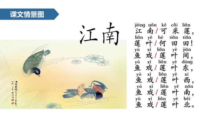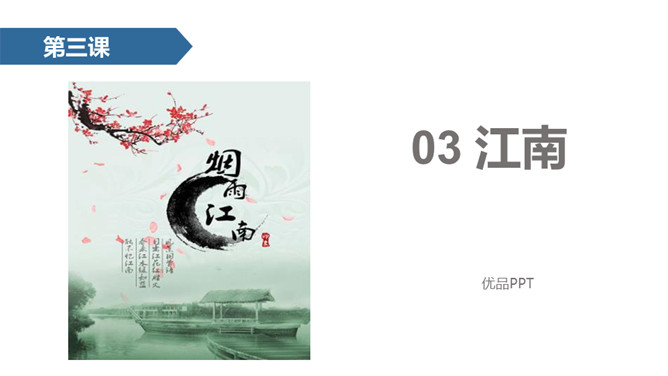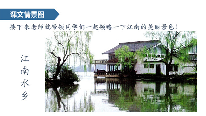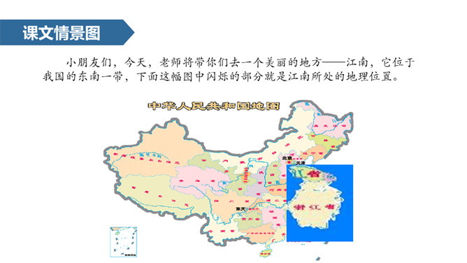 小朋友们,今天,老师将带你们去一个美丽的地方——江南,它位于我国的东南一带,下面这幅图中闪烁的部分就是江南所处的地理位置。接下来老师就带领同学们一起领略一下江南的美丽景色!通过本课的学习,我们学会了本课的生字,理解了诗句的意思,看到了江南水乡的美丽景色,感受到了大自然是多么美好,我们以后要更加热爱大自然,保护大自然。从本课的学习中,我们还体会到了阅读古诗的乐趣,希望今后继续努力,多阅读多积累一些优秀的古诗。所属专题:江南ppt。