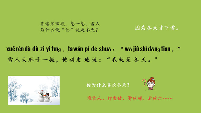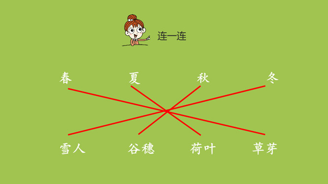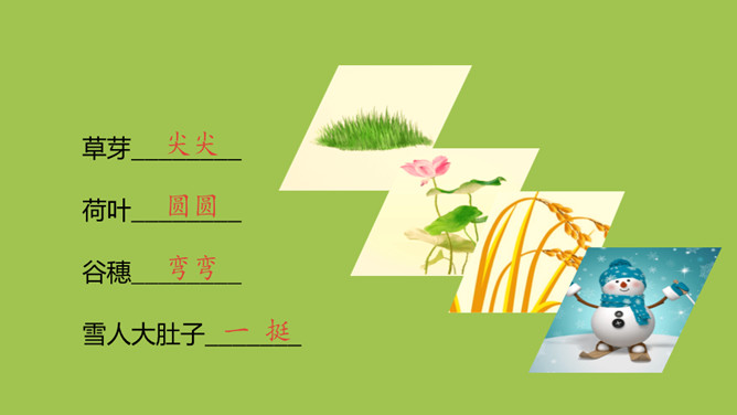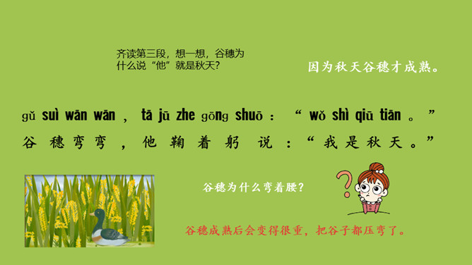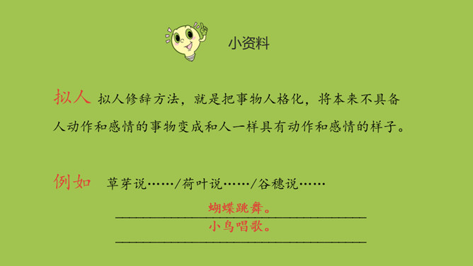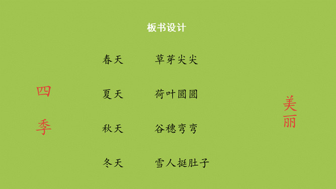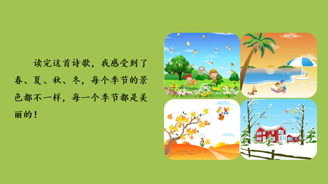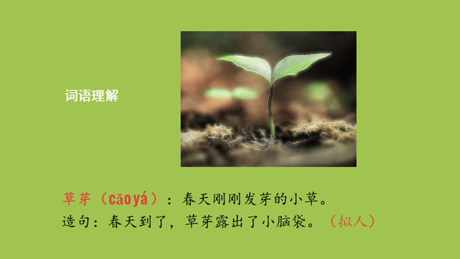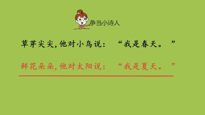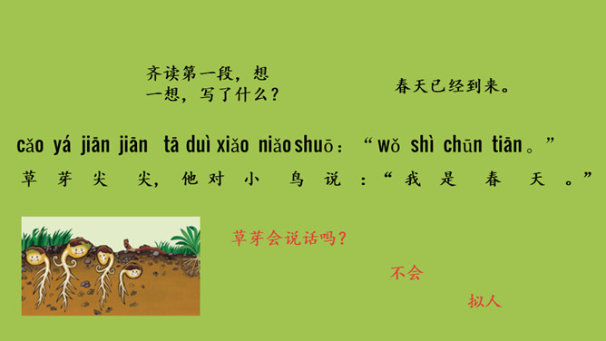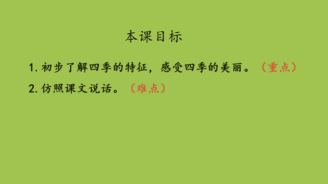 本课目标:1.初步了解四季的特征,感受四季的美丽。(重点) 2.仿照课文说话。(难点)齐读第一段,想一想,写了什么?春天已经到来。草芽会说话吗?不会,拟人。拟人修辞方法,就是把事物人格化,将本来不具备人动作和感情的事物变成和人一样具有动作和感情的样子。齐读第二段,想一想,荷叶为什么说“他”就是夏天?因为夏天才有荷叶。你还从哪些地方知道夏天来了?百花盛开、天气炎热、枝繁叶茂……所属专题:四季ppt。