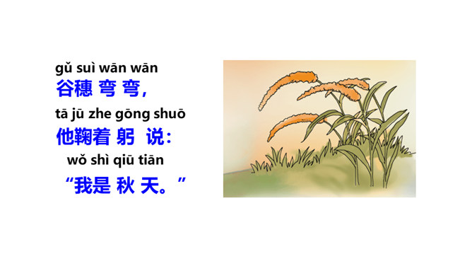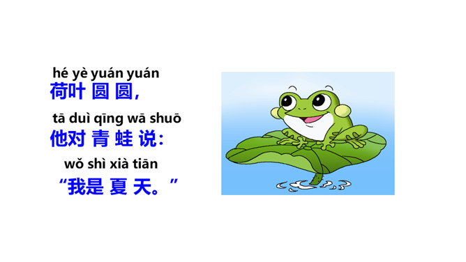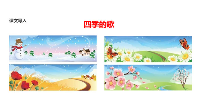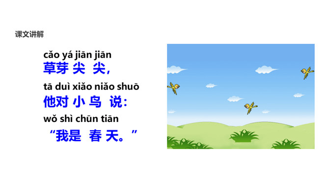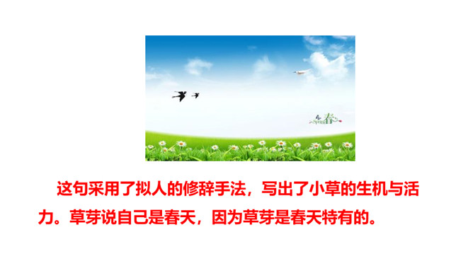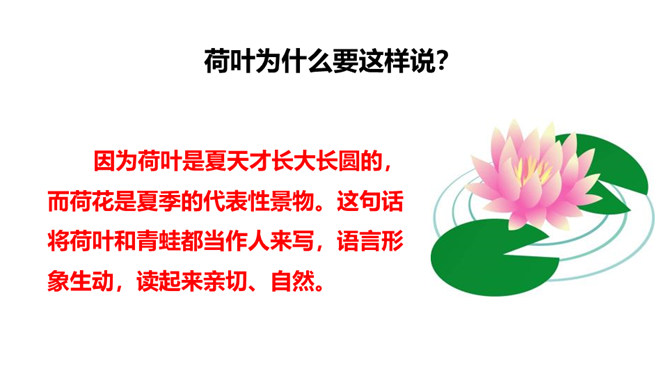 学习目标:1.会认10个生字、会写3个生字;认识“讠、虫、 ”3个偏旁。2.正确、流利、有感情地朗读课文。背诵课文。3.了解课文内容,知道一年有四季及四季的特征,激发学生对大自然的喜爱之情。这句采用了拟人的修辞手法,写出了小草的生机与活力。草芽说自己是春天,因为草芽是春天特有的。荷叶为什么要这样说?因为荷叶是夏天才长大长圆的,而荷花是夏季的代表性景物。这句话将荷叶和青蛙都当作人来写,语言形象生动,读起来亲切、自然。所属专题:四季ppt。