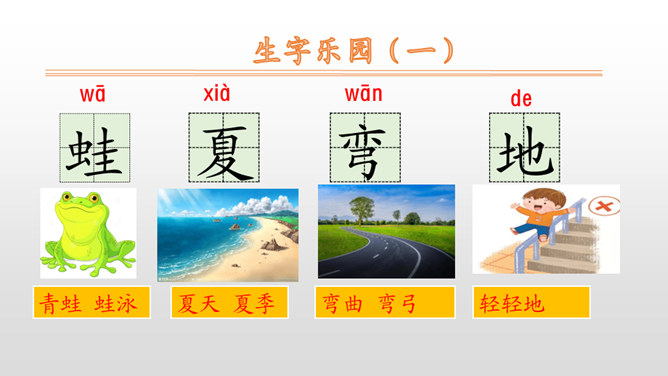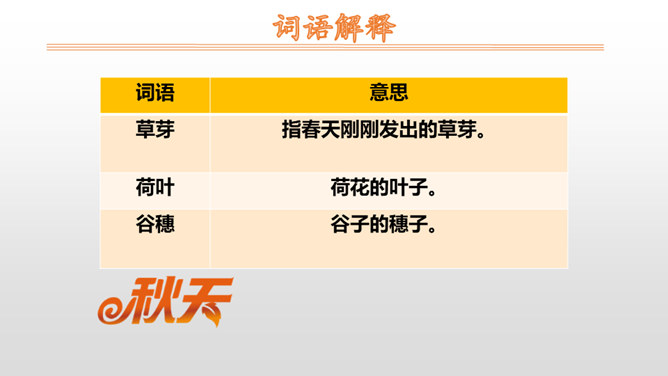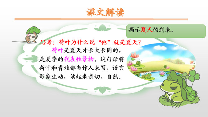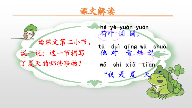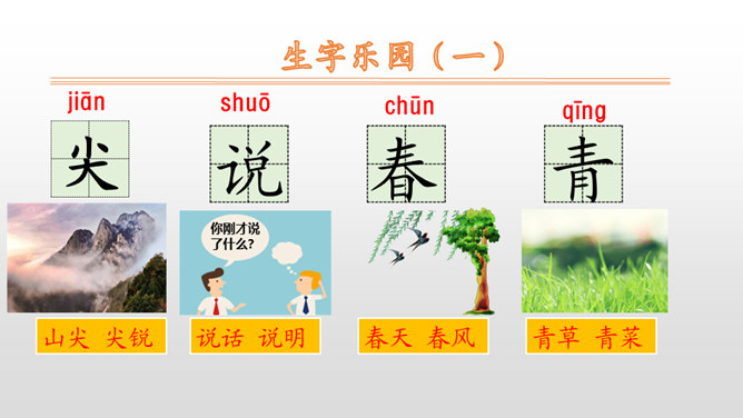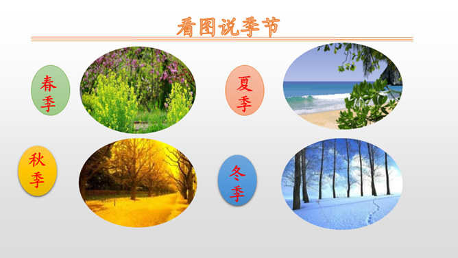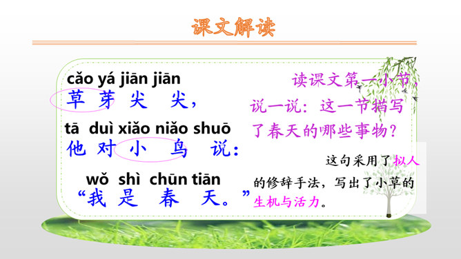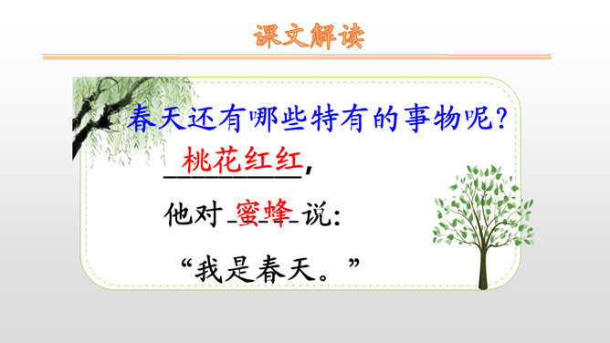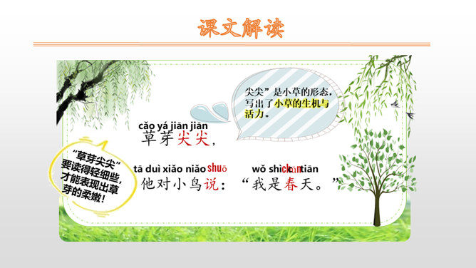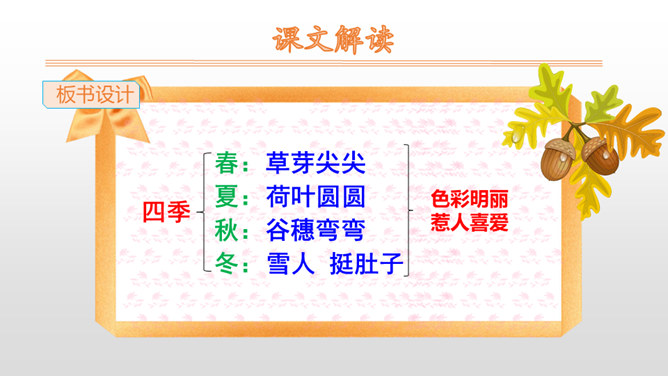 读课文第一小节,说一说:这一节描写了春天的哪些事物?1)朗读课文。解析 首先要大声地读,加深自己的感受,如“草芽尖尖”可读得轻些,表现出草芽的柔嫩;谷穗“鞠着躬说”,可以读出谦虚的感觉;“雪人大肚子一挺”可以做出挺肚子的动作,以表现顽皮的样子。同学们,在一年四季中一定有你最喜欢的季节,有的同学有可能因为喜欢堆雪人,所以喜欢冬天;有的同学也有可能说:“秋天是收获的季节,所以我最喜欢秋天。”所属专题:四季ppt。