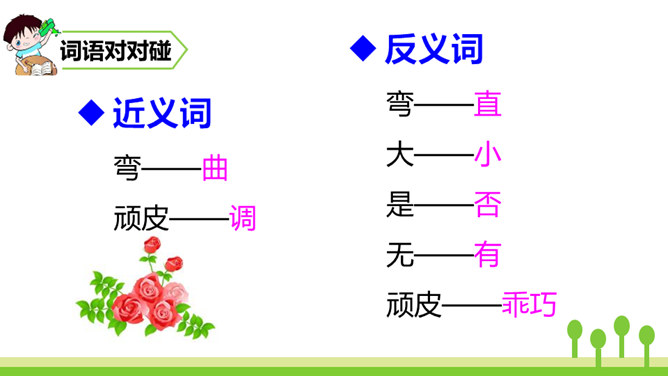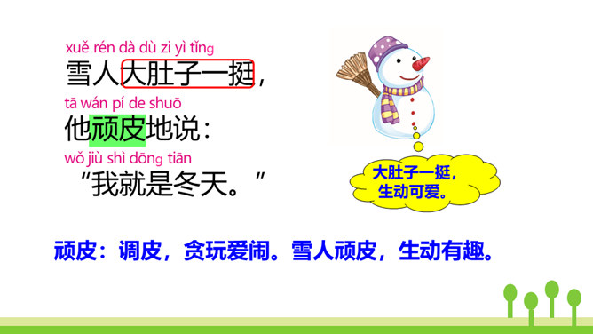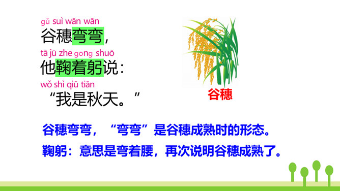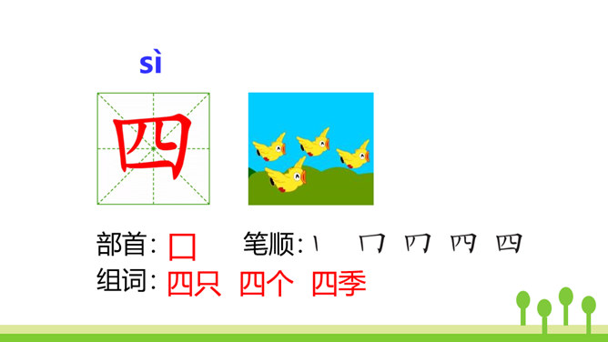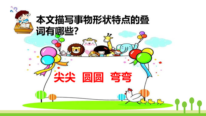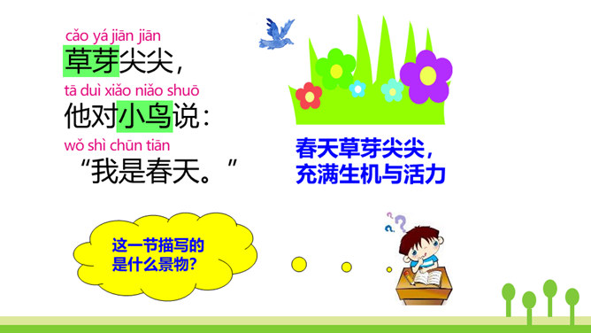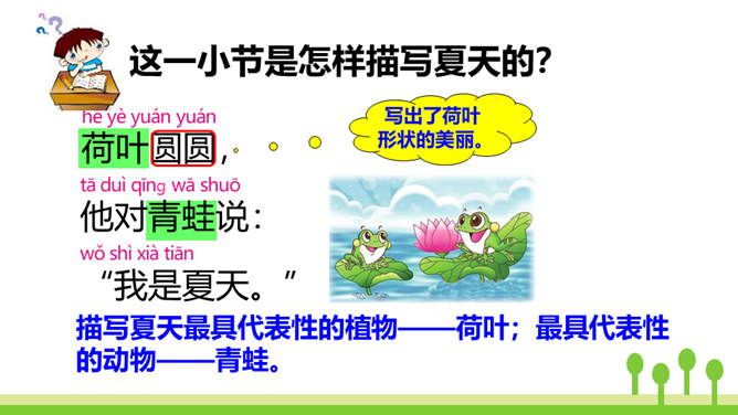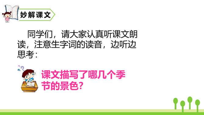 同学们,请大家认真听课文朗读,注意生字词的读音,边听边思考:课文描写了哪几个季节的景色?在春夏秋冬四个季节中,你还能想到哪些代表性的事物?听写词语。在田字格中抄写本课生字。有感情地朗读课文。背诵课文。本文描写事物形状特点的叠词有哪些?结束语:春天桃花开,夏天荷叶圆,秋天果子熟,冬天雪花飘。小朋友,一年四季,风光各异,让我们牢牢记住四美丽的四季吧!所属专题:四季ppt。