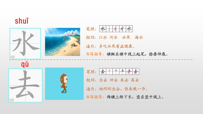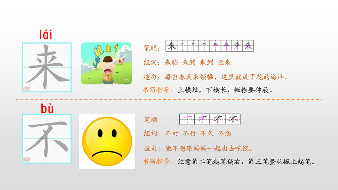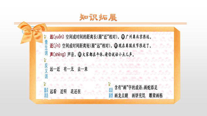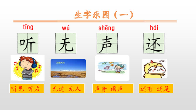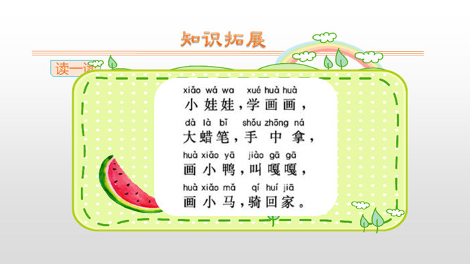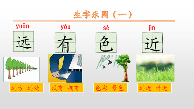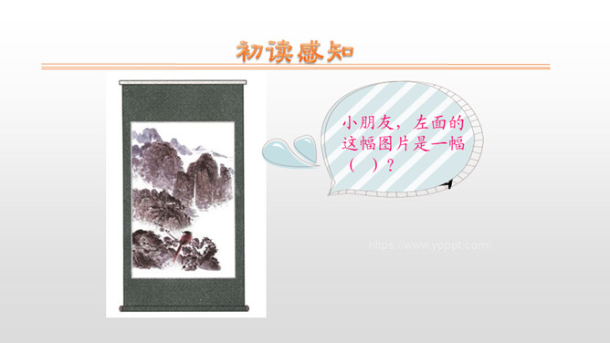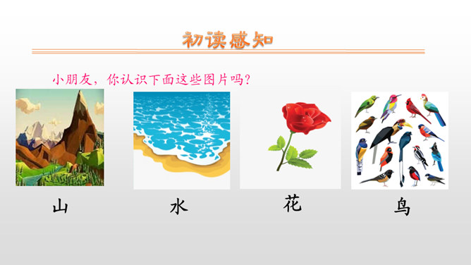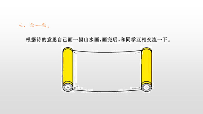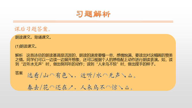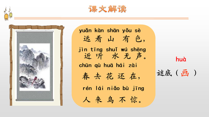 这是一首谜语诗,诗人通过文字的描述,把一幅美丽的风景卷轴展现出来:苍翠的山,流动的水,绽放的花,可爱的鸟,一派鲜活的景象。全诗表达了诗人对画中美好事物的向往之情。这首诗总的朗读基调是活泼的,朗读的速度要慢一些,感情饱满,要读出对这幅画的赞美之情。同学们可以一边读一边展开想象,还可以根据个人的感悟配上动作进行朗读表演。如,读到“近听水无声”时,做出侧耳听的动作;读到“人来鸟不惊”时,做出摆手的样子。