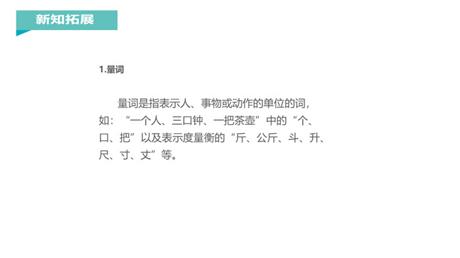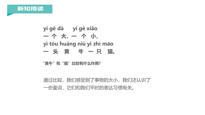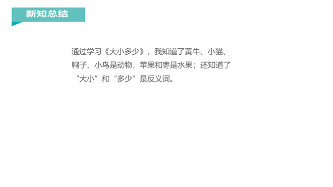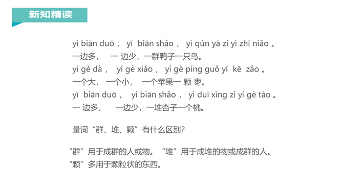 小朋友,在我们的生活中有许多的事物,量词就是表示这些事物的数量的单位词。而每一种事物都有固定的量词。生活中我们经常会说:一面旗、两辆车、三头牛……那么,你会正确地使用量词吗?今天就让我们来认识这些量词。量词“群、堆、颗”有什么区别?“群”用于成群的人或物。“堆”用于成堆的物或成群的人。“颗”多用于颗粒状的东西。通过学习《大小多少》,我知道了黄牛、小猫、鸭子、小鸟是动物,苹果和枣是水果;还知道了“大小”和“多少”是反义词。所属专题:大小多少ppt。