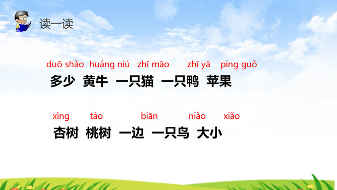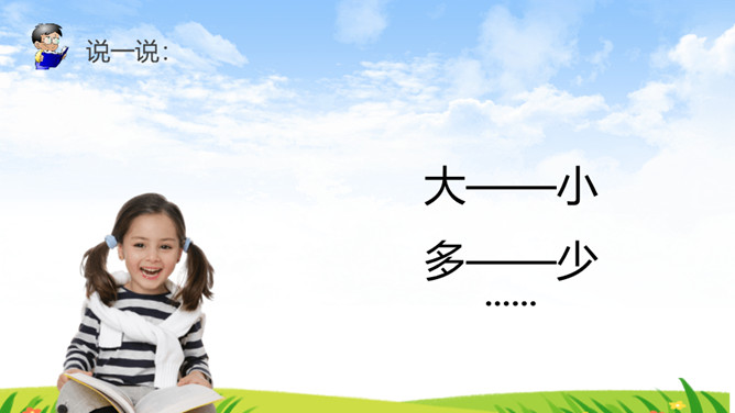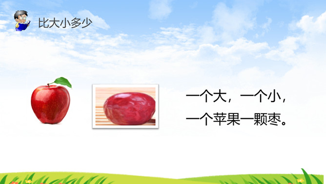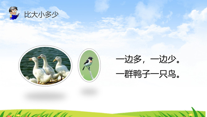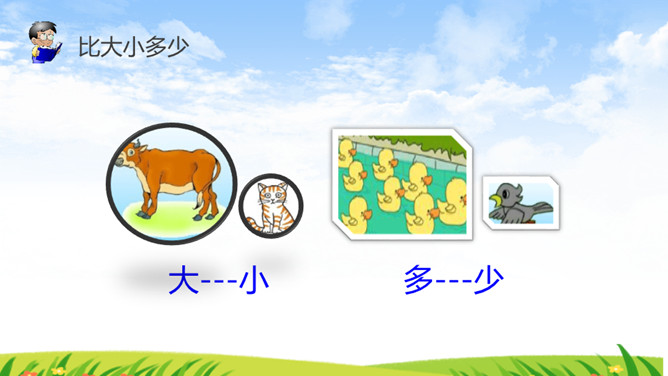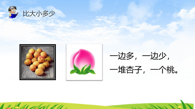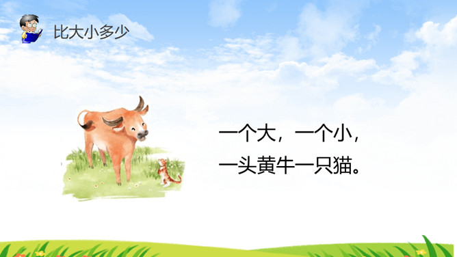 《识字7 大小多少》部编版语文课件 一年级上册。比大小多少:一个大,一个小,一头黄牛一只猫。一边多,一边少。一群鸭子一只鸟。一个大,一个小,一个苹果一颗枣。一边多,一边少,一堆杏子,一个桃。所属专题:大小多少ppt。
