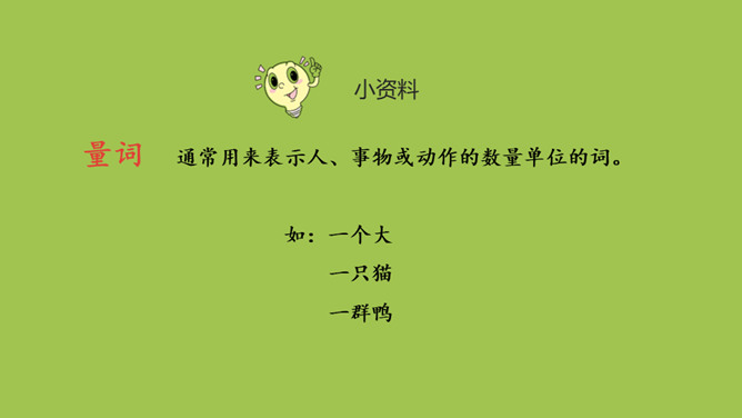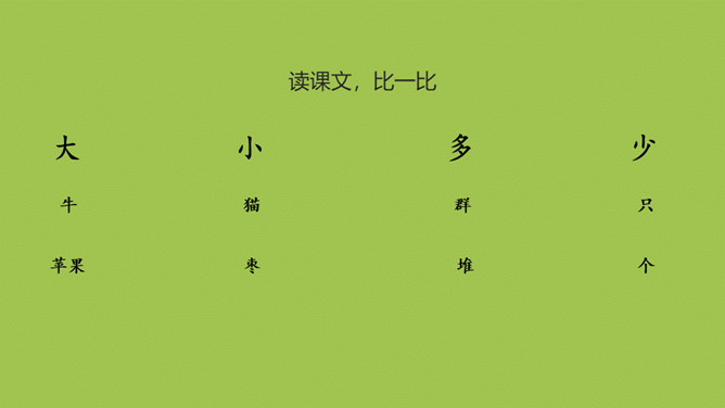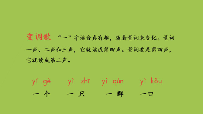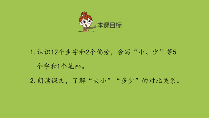 本课目标:1.认识12个生字和2个偏旁,会写“小、少”等5个字和1个笔画。 2.朗读课文,了解“大小”“多少”的对比关系。量词 通常用来表示人、事物或动作的数量单位的词。变调歌 “一”字读音真有趣,随着量词来变化。量词一声、二声和三声,它就读成第四声。量词要是第四声,它就读成第二声。所属专题:大小多少ppt。