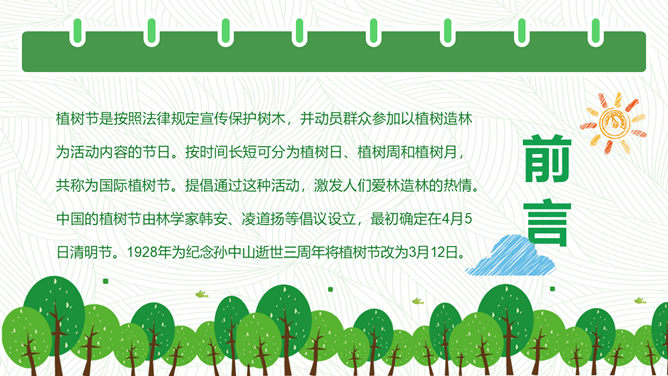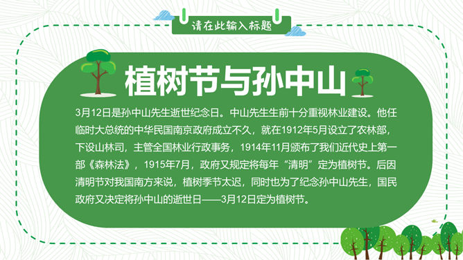 卡通植树节班会PPT模板。包括植树节的历史、由来和作用,植树节与孙中山,知识竞答环节,宣传标语等内容。