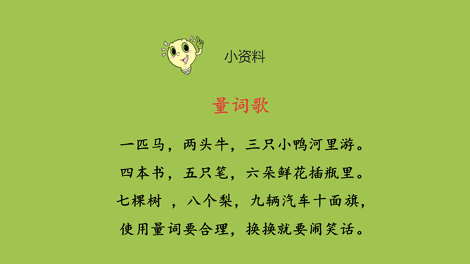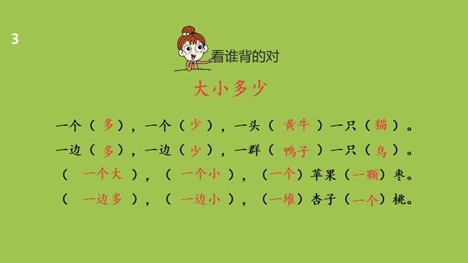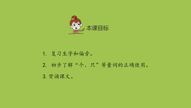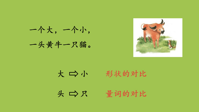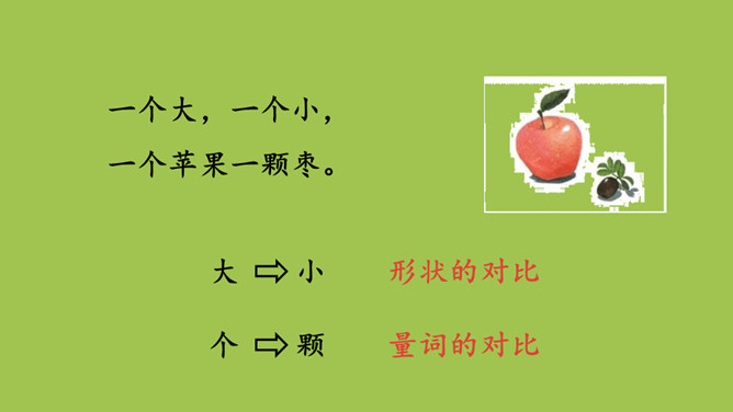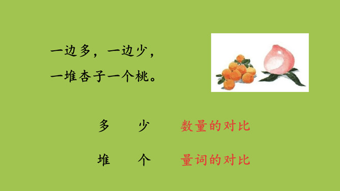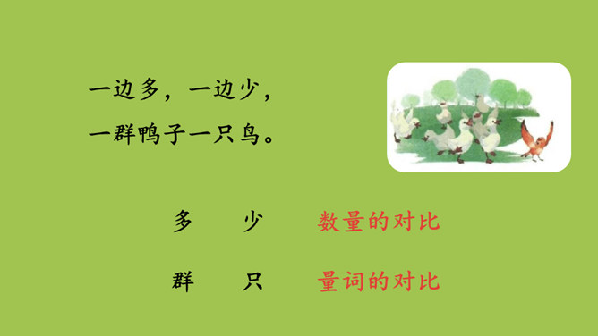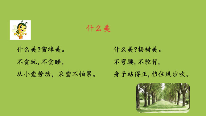 复习生字和偏旁。初步了解“个、只”等量词的正确使用。背诵课文。本课由图画和韵文组成,通过事物之间比较,让我们了解了“大、小” “多、少”两对反义词,同时认识了量词。什么美?蜜蜂美。不贪玩,不贪睡,从小爱劳动,采蜜不怕累。什么美?杨树美。不弯腰,不驼背,身子站得正,挡住风沙吹。所属专题:大小多少ppt。