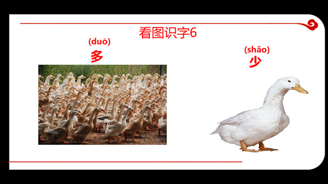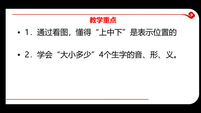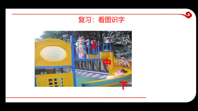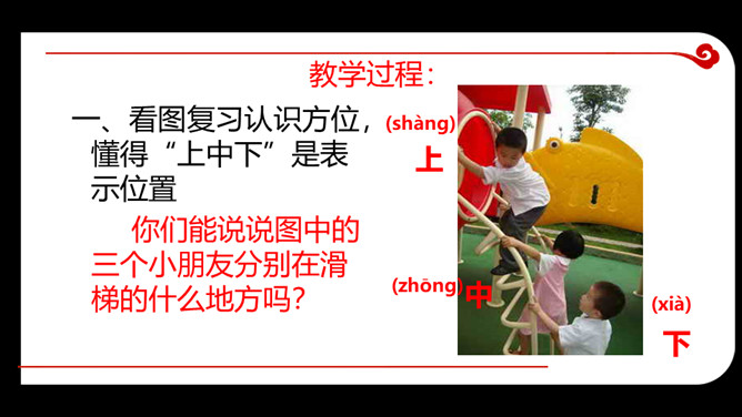 教学目的:1.复习巩固汉语拼音“ 上中下 ”。2.能看懂图意,通过看图初步认识方位,懂得“上中下”是表示位置的。3.学会“大小多少”4个生字的音、形、义。教学重点:1.通过看图,懂得“上中下”是表示位置的2.学会“大小多少”4个生字的音、形、义。教学过程:一、看图复习认识方位,懂得“上中下”是表示位置你们能说说图中的三个小朋友分别在滑梯的什么地方吗?所属专题:大小多少ppt。