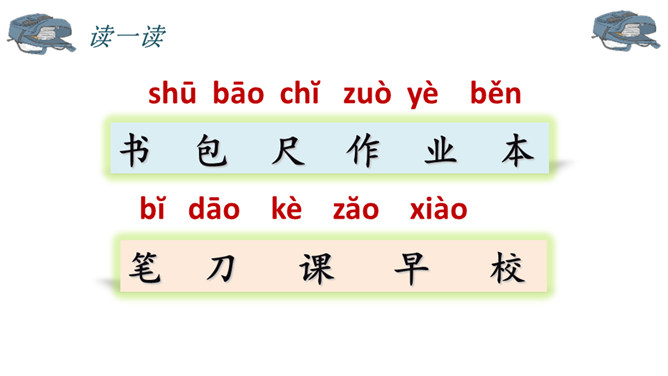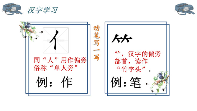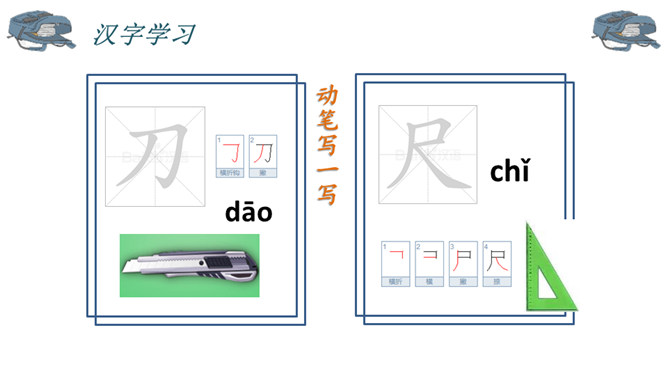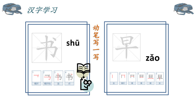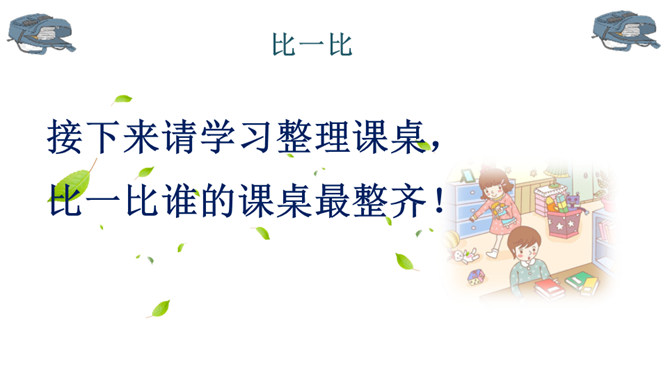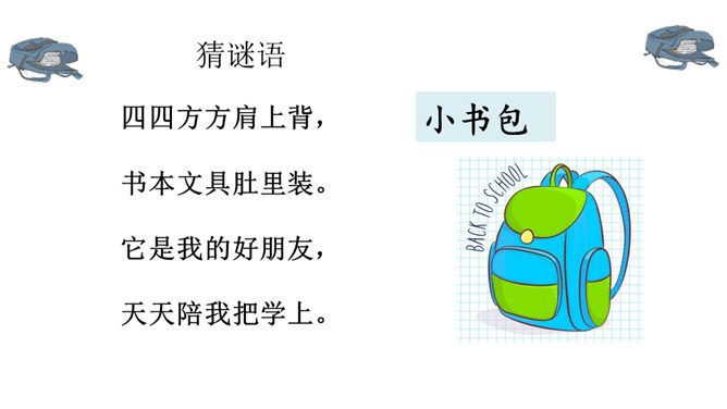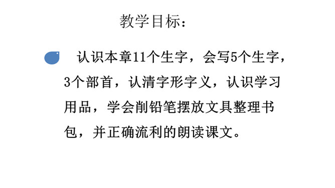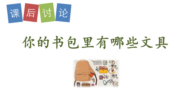 认识本章11个生字,会写5个生字,3个部首,认清字形字义,认识学习用品,学会削铅笔摆放文具整理书包,并正确流利的朗读课文。猜谜语:四四方方肩上背,书本文具肚里装。它是我的好朋友,天天陪我把学上。你的书包里有哪些文具?接下来请学习整理课桌,比一比谁的课桌最整齐!所属专题:小书包ppt。
