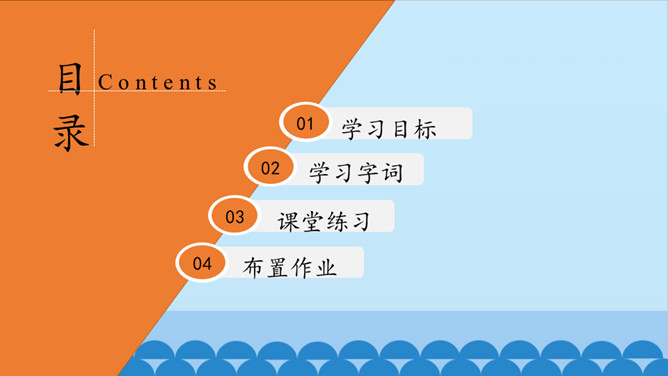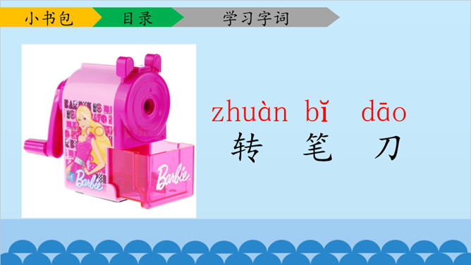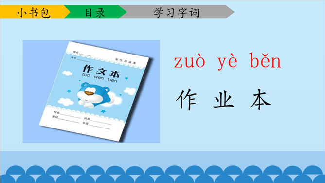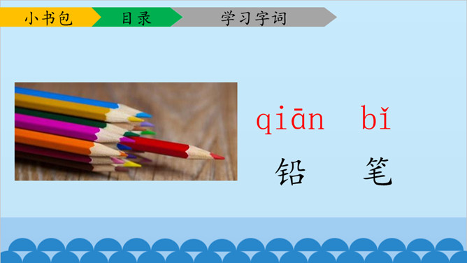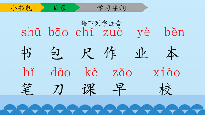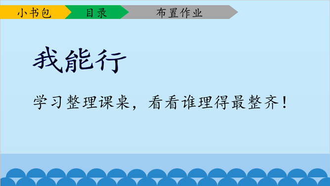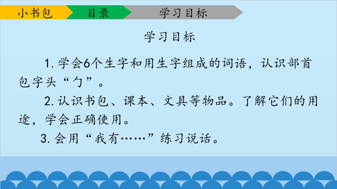 1.学会6个生字和用生字组成的词语,认识部首包字头“勹”。 2.认识书包、课本、文具等物品。了解它们的用途,学会正确使用。3.会用“我有……”练习说话。说一说:你的书包里有哪些文具?我能行:学习整理课桌,看看谁理得最整齐!看谁背得快。我的小书包,宝贝真不少。课本作业本,铅笔转笔刀。上课静悄悄,下课不乱跑。天天起得早,陪我去学校。所属专题:小书包ppt。