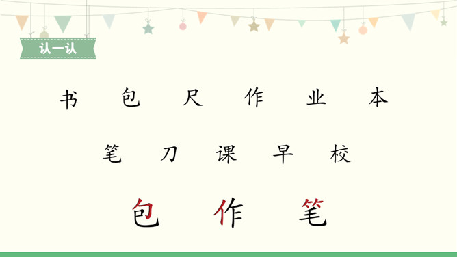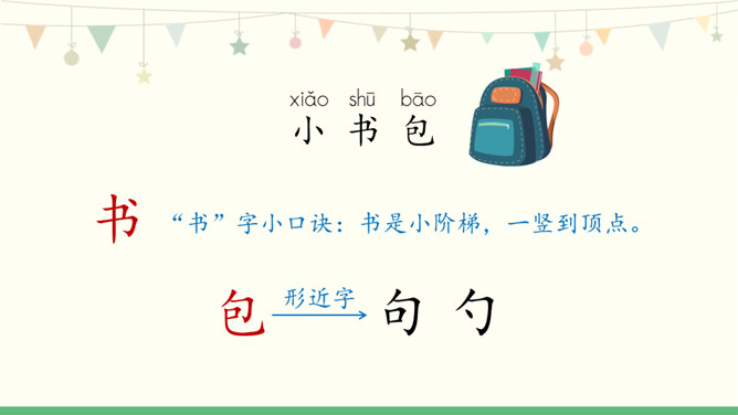 猜一猜:小黑人儿细又长,穿着木头花衣裳。画画写字它全会,就是不会把歌唱。像糖不是糖,有长也有方,帮你改错字,它可不怕脏。有方有圆,有高有矮,肚里有笔,书包中藏。小方盒, 薄又薄,里面知识可真多!“书”字小口诀:书是小阶梯,一竖到顶点。所属专题:小书包ppt。